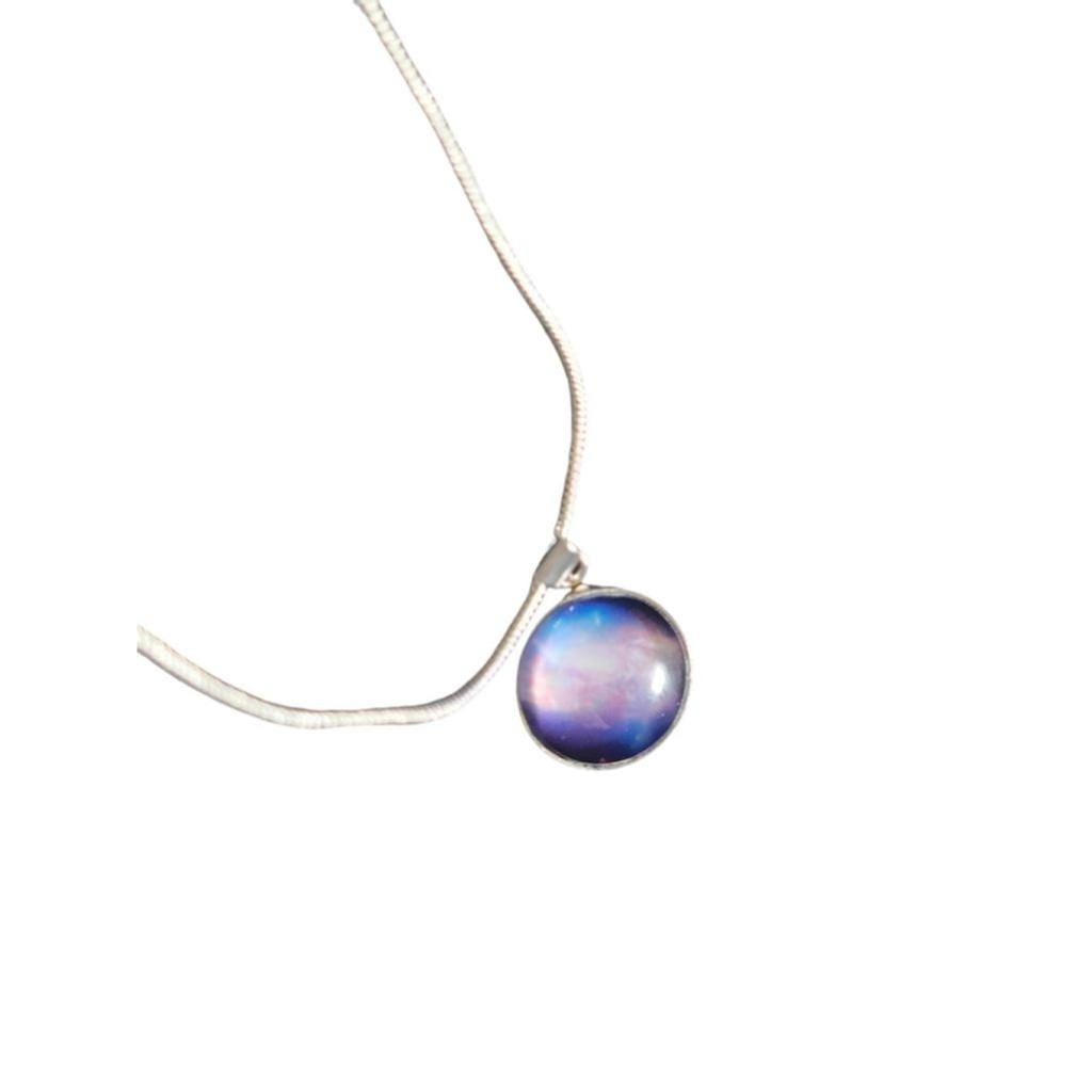 Hand crafted 12 mm nebula galaxy in purple hues on a pendant made of stainless steel bezel tray, hung on an 18" 925 stamped sterling silver necklace.