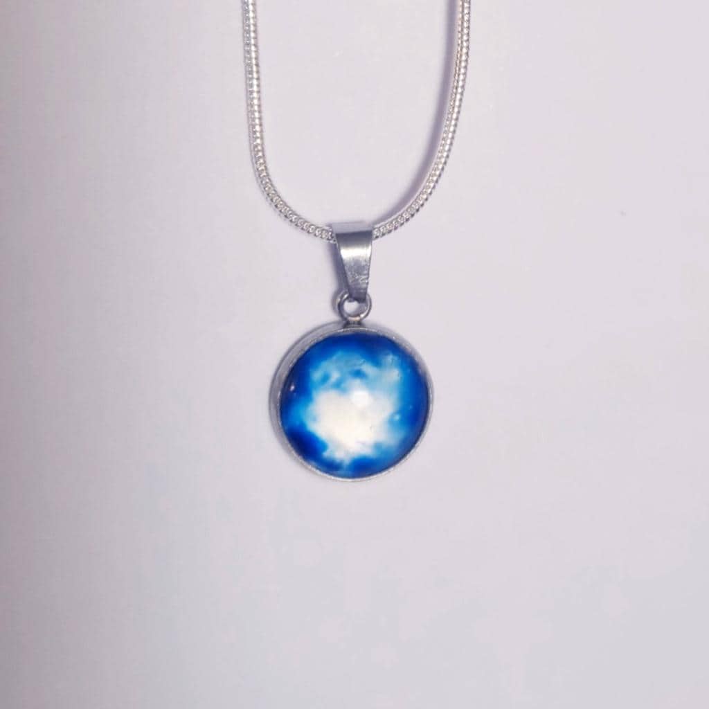 Hand crafted 12 mm nebula galaxy in blue hues on a pendant made of stainless steel bezel tray, hung on an 18" 925 stamped sterling silver necklace.