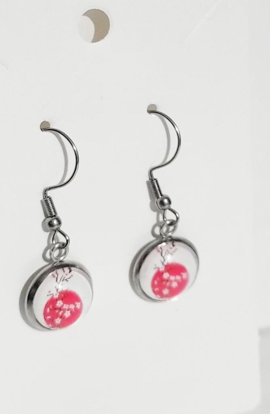 Artisan made cherry blossom dangle drop earrings on a stainless steel bezel tray, with wire hooks.