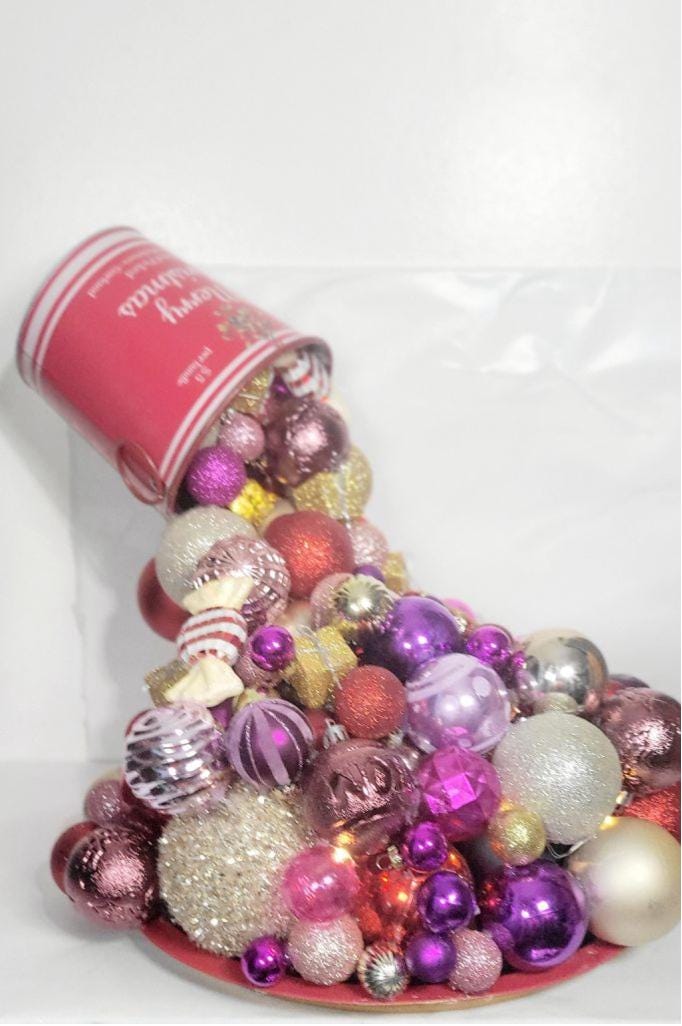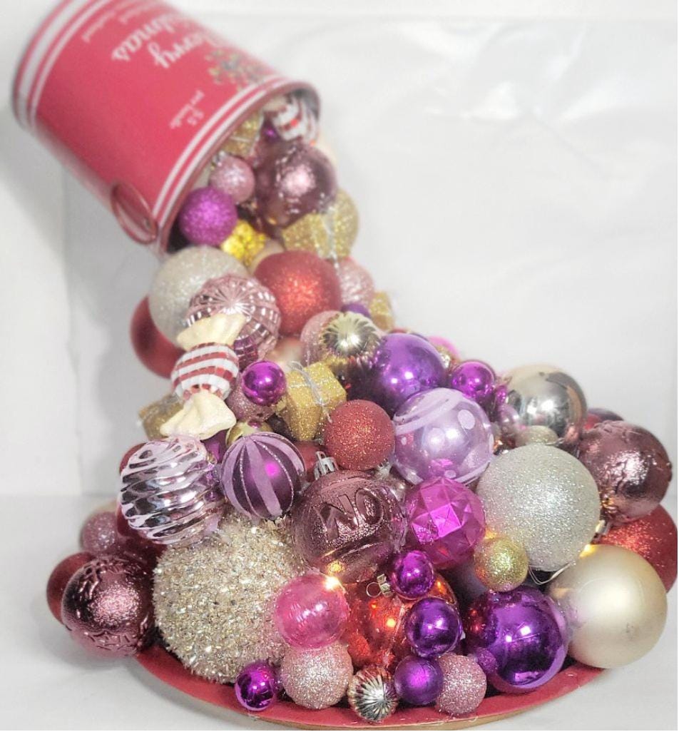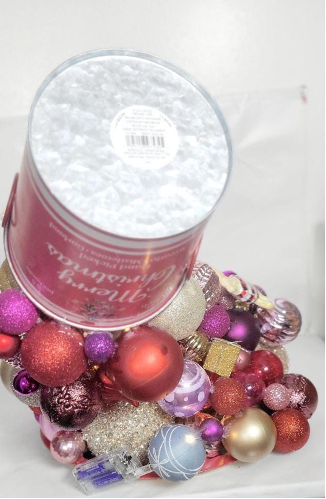 Bring in the Holiday cheer with this artisan made magical floating Merry Christmas Ashland red metal bucket, pouring out a variety of shapes and sized ornaments, in shades of pinks, reds, purples, and golds, with gold present boxes, and candy, onto a Santa Christmas platter, with a gold bottom, and battery operated fairy lights woven throughout the ornaments . Measurements are approximately 12x16x12" and weighs 4.2 pounds.