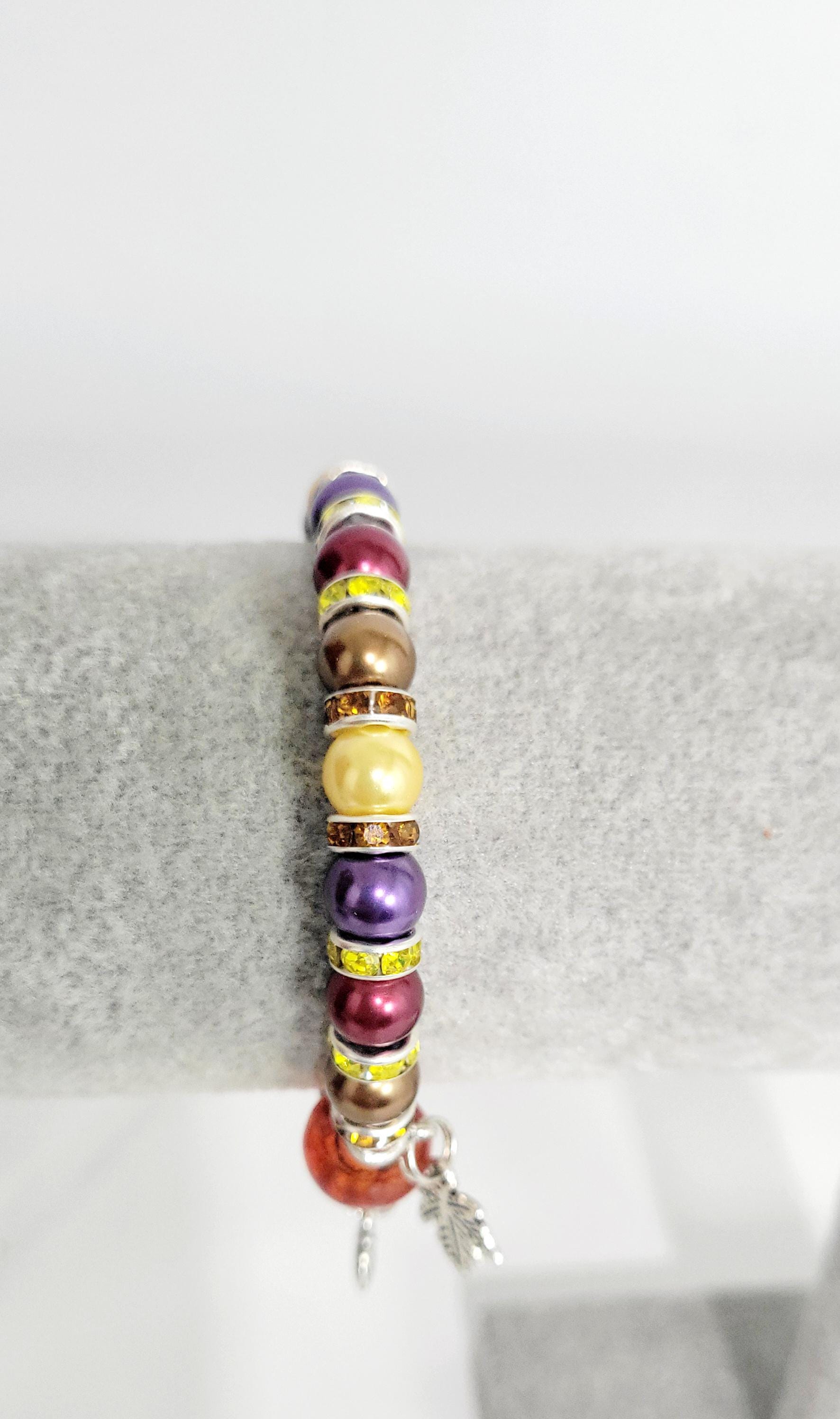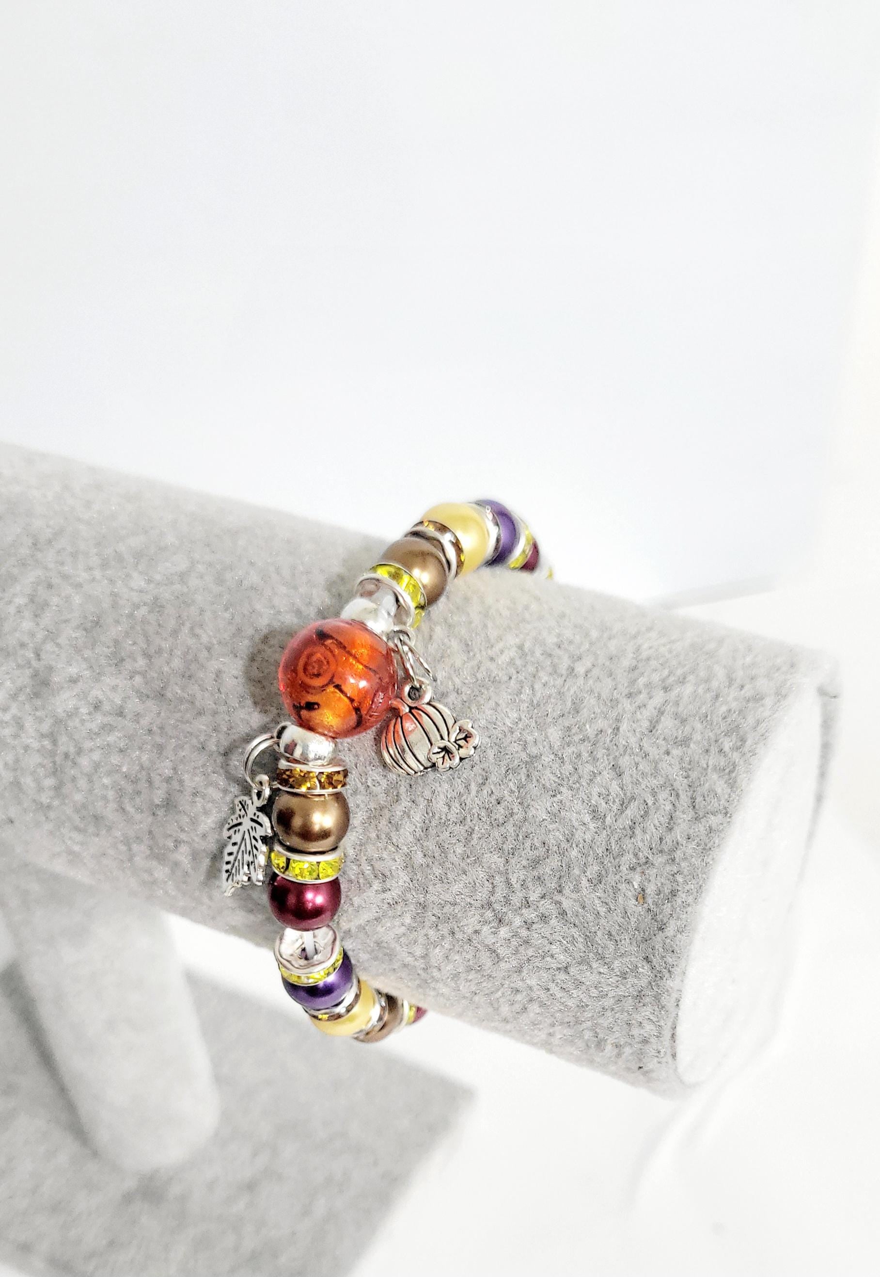 Hand crafted Autumn Fall themed bracelet, in red, purple, brown, and gold glass beads, 1 large main red bead, with brown and yellow rhinestone spacers, pumpkin and leaf charms hanging from charm holders, on a stretchy cord. Measurements are approximately 7-7.5".