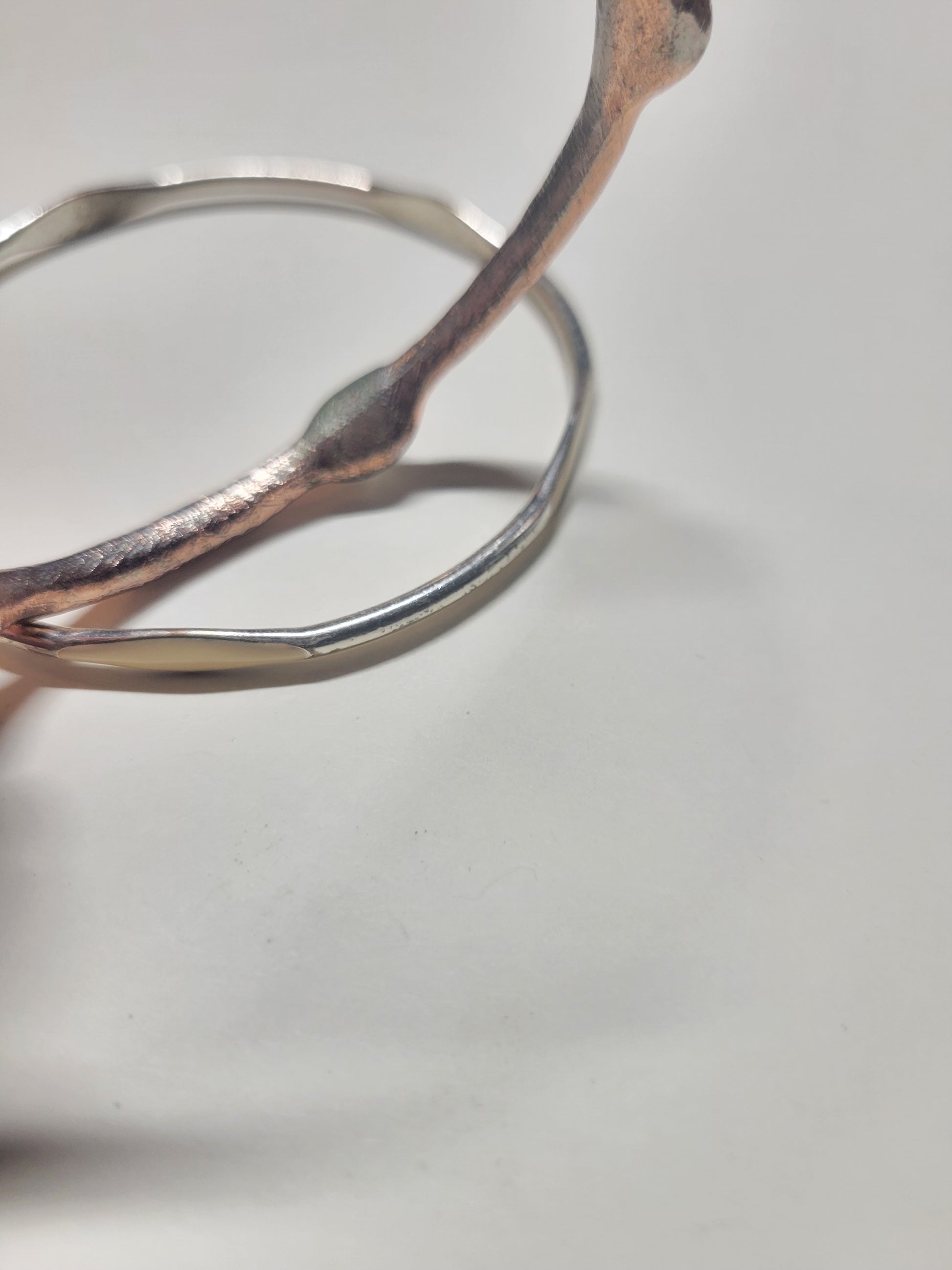 Used set of 7" bangle bracelets. One in copper tone with rhinestones spaced across the band. Some wear is visible. The 2nd bracelet is silver with faux ivory. Best fits a 6-6.5" wrist.