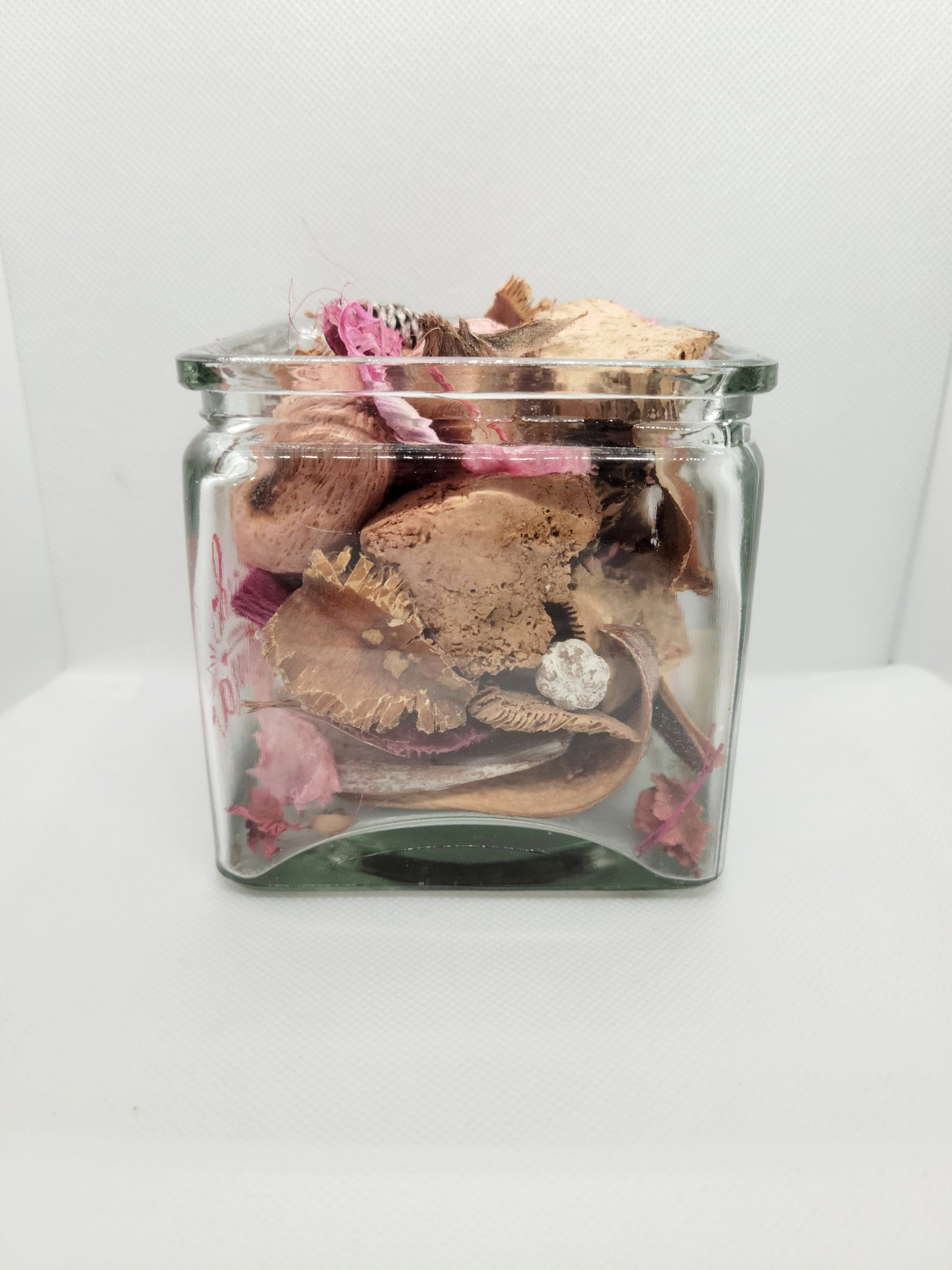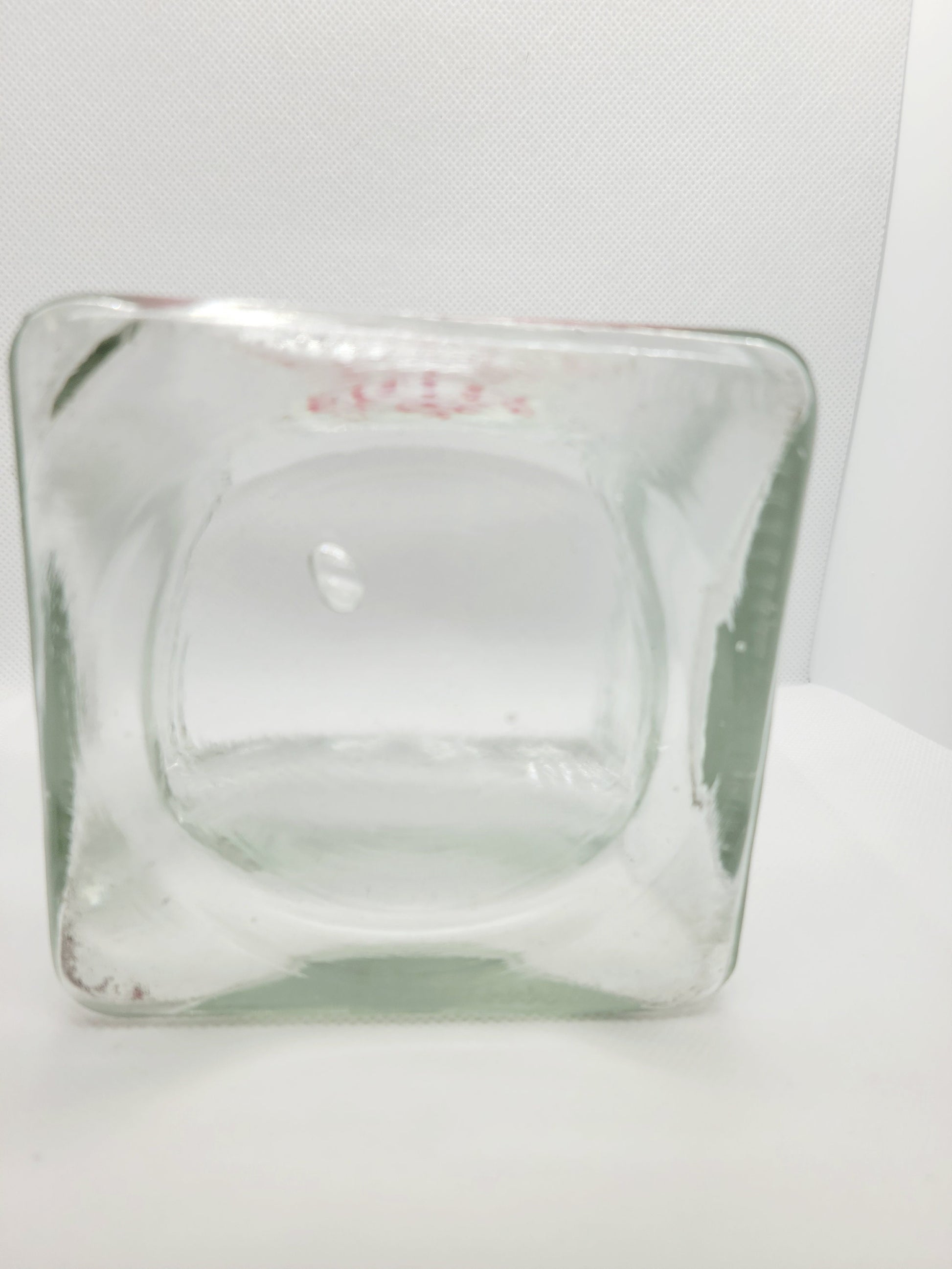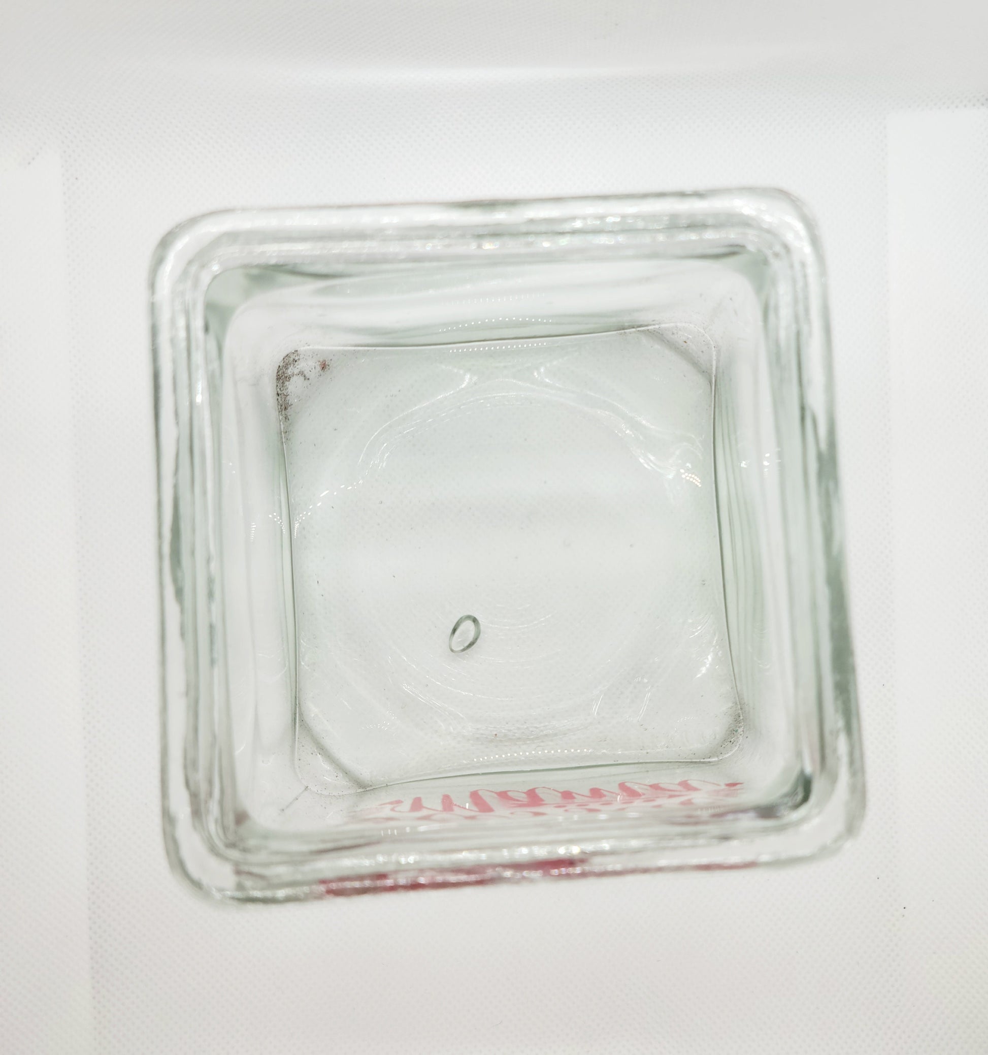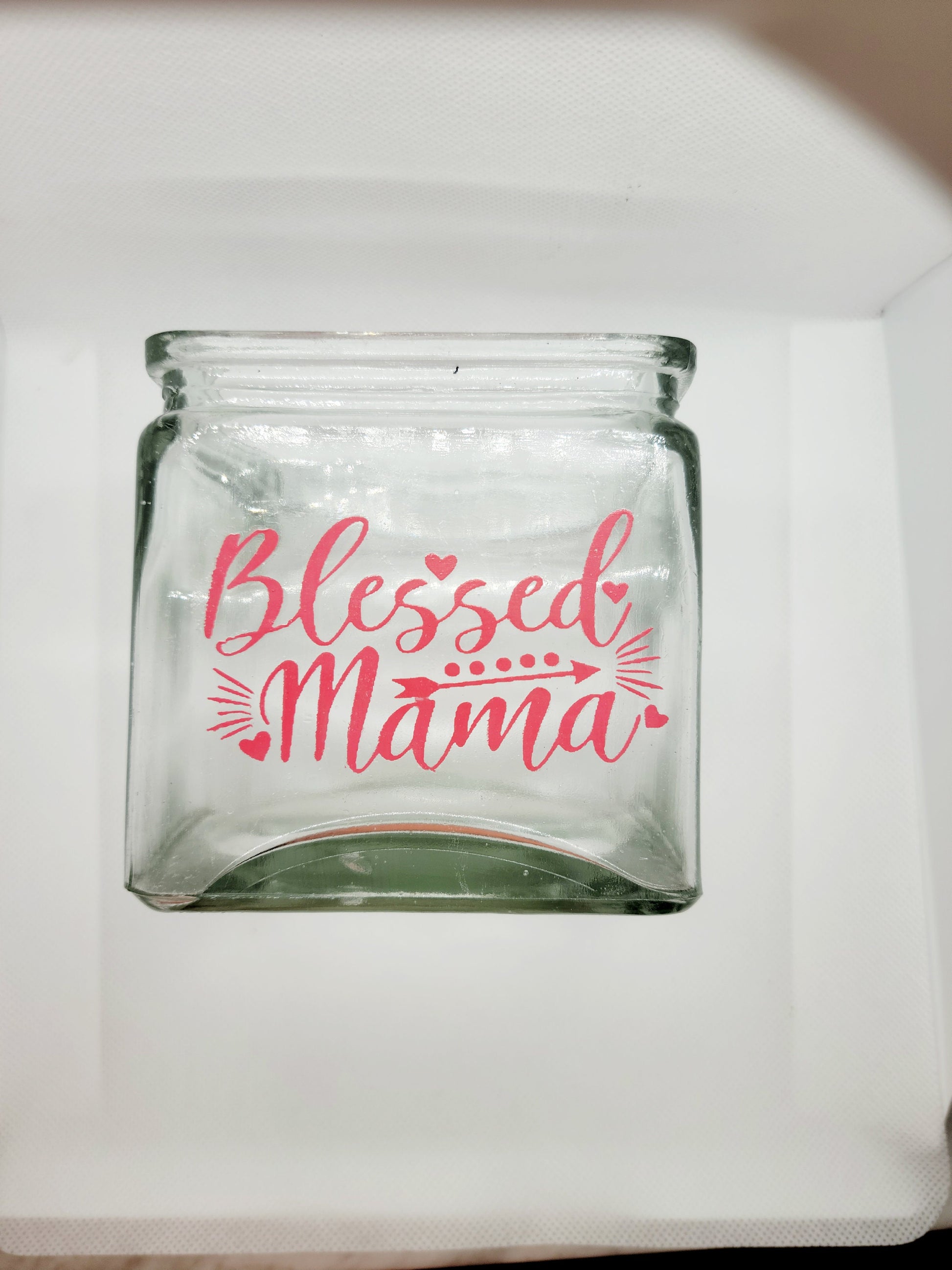Handpainted 3x3" jar with "Blessed Mama" on it in a reddish pink paint. The jar can hold a candle, potpourri, or other small objects. There is a small blemish in the bottom of the jar, as shown. Potpourri not included.