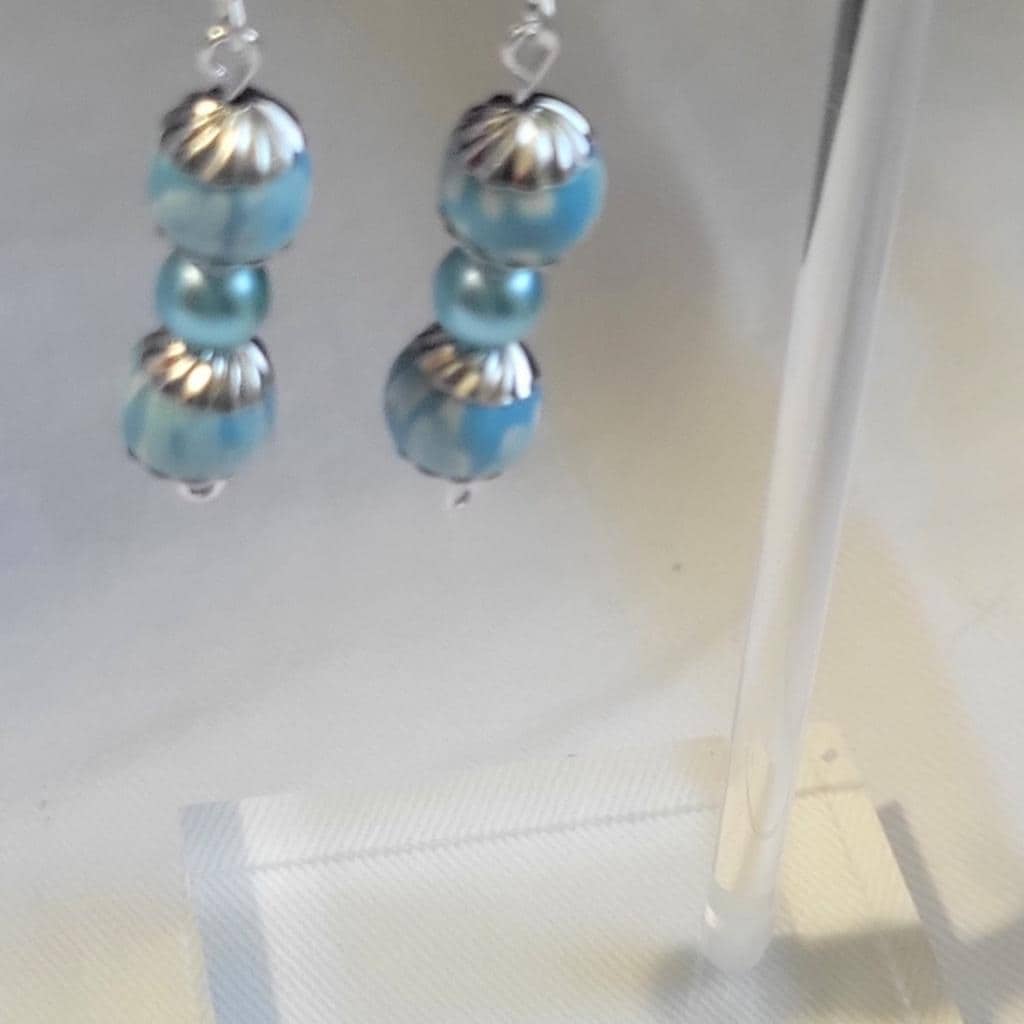 Blue & white clay bead dangle drop earrings, with blue & metal spacer beads, with a pierced ear hook. Measurements are approximately 1".