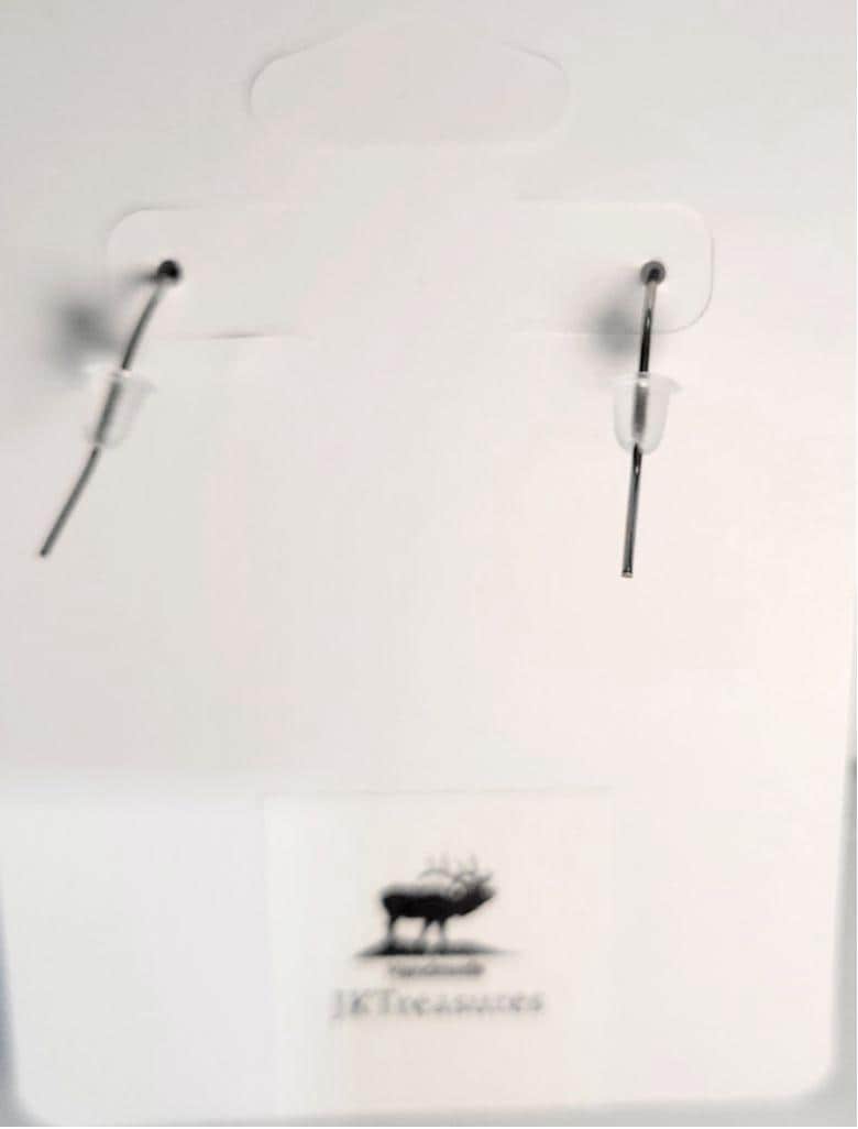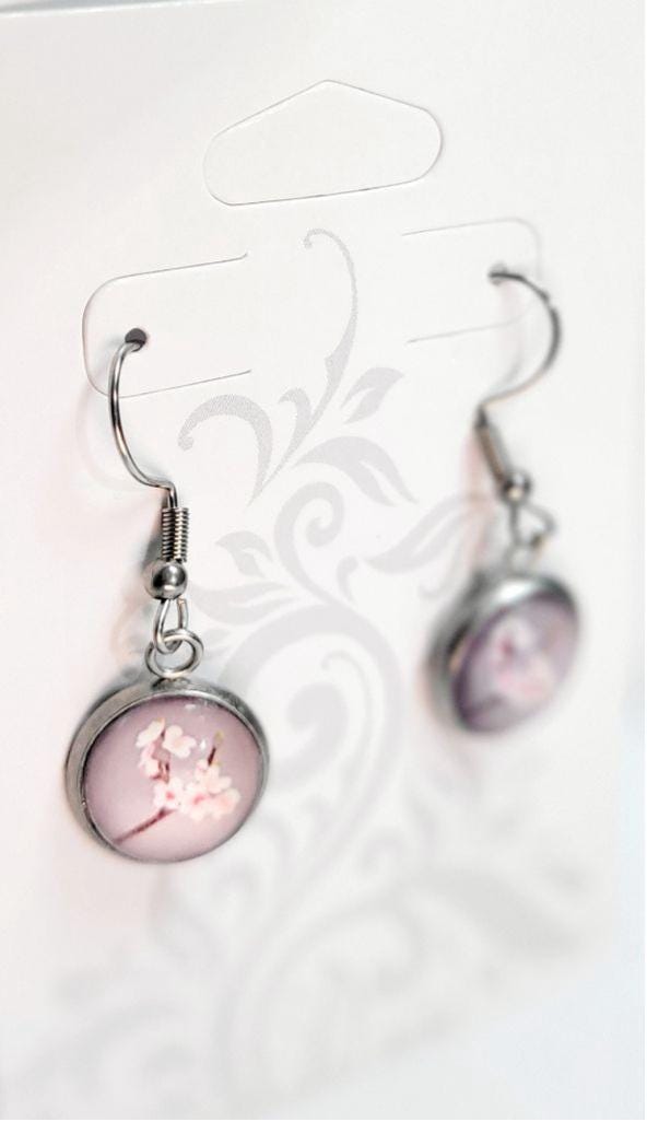 Artisan made Cherry Blossom cabochon dangle drop earrings on a silver tone bevel tray and hook wires.