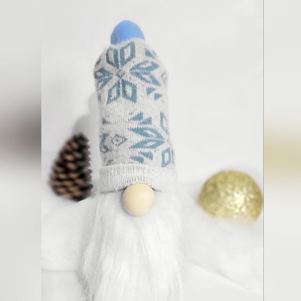 Handmade 7" Christmas sock gnome, with a snowflake themed outfit and hat, white beard, and wood nose.