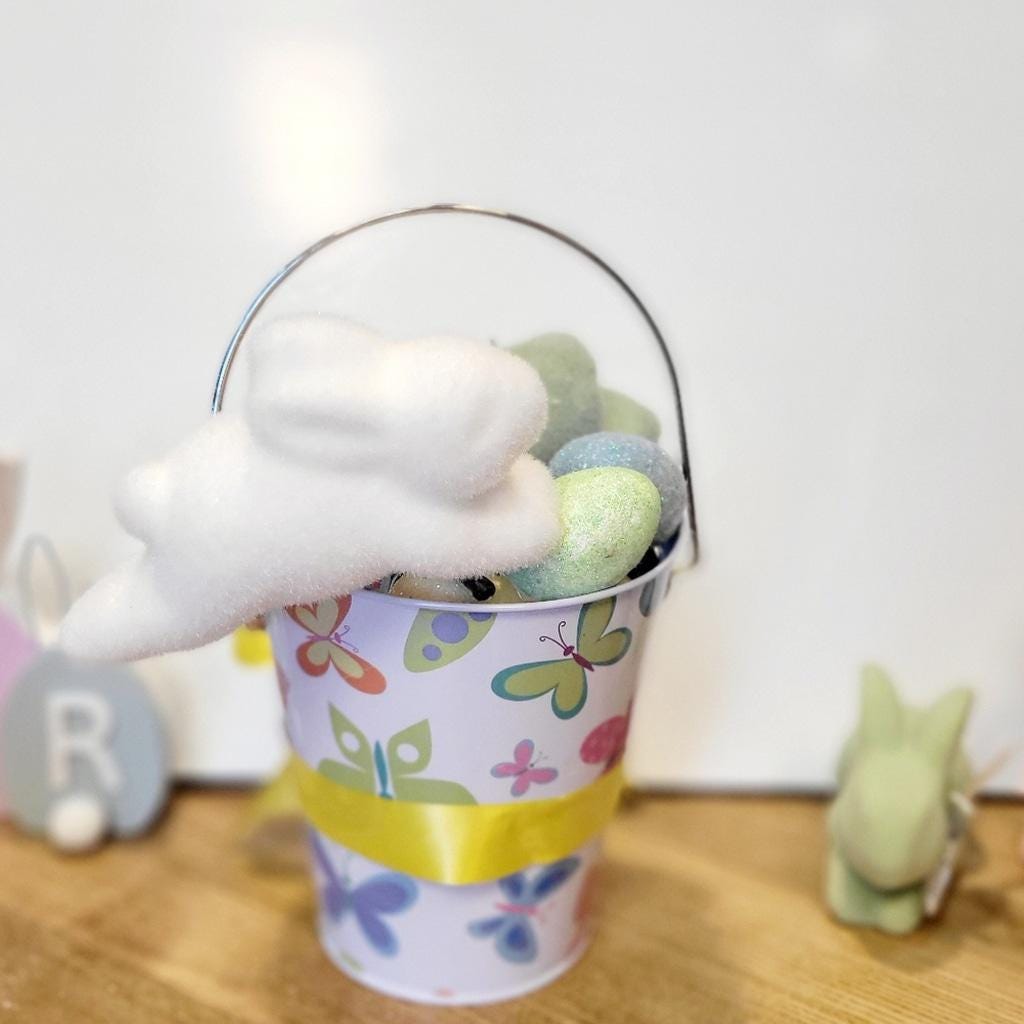 Hand crafted charming Easter bucket with a vibrant yellow ribbon. Features colorful butterfly and flower designs. The 4.5" tall bucket is filled with blue grass, matte and glitter eggs, pink and white plumerias, and 1 green and 1 white bunny. Bucket is only item for sale.