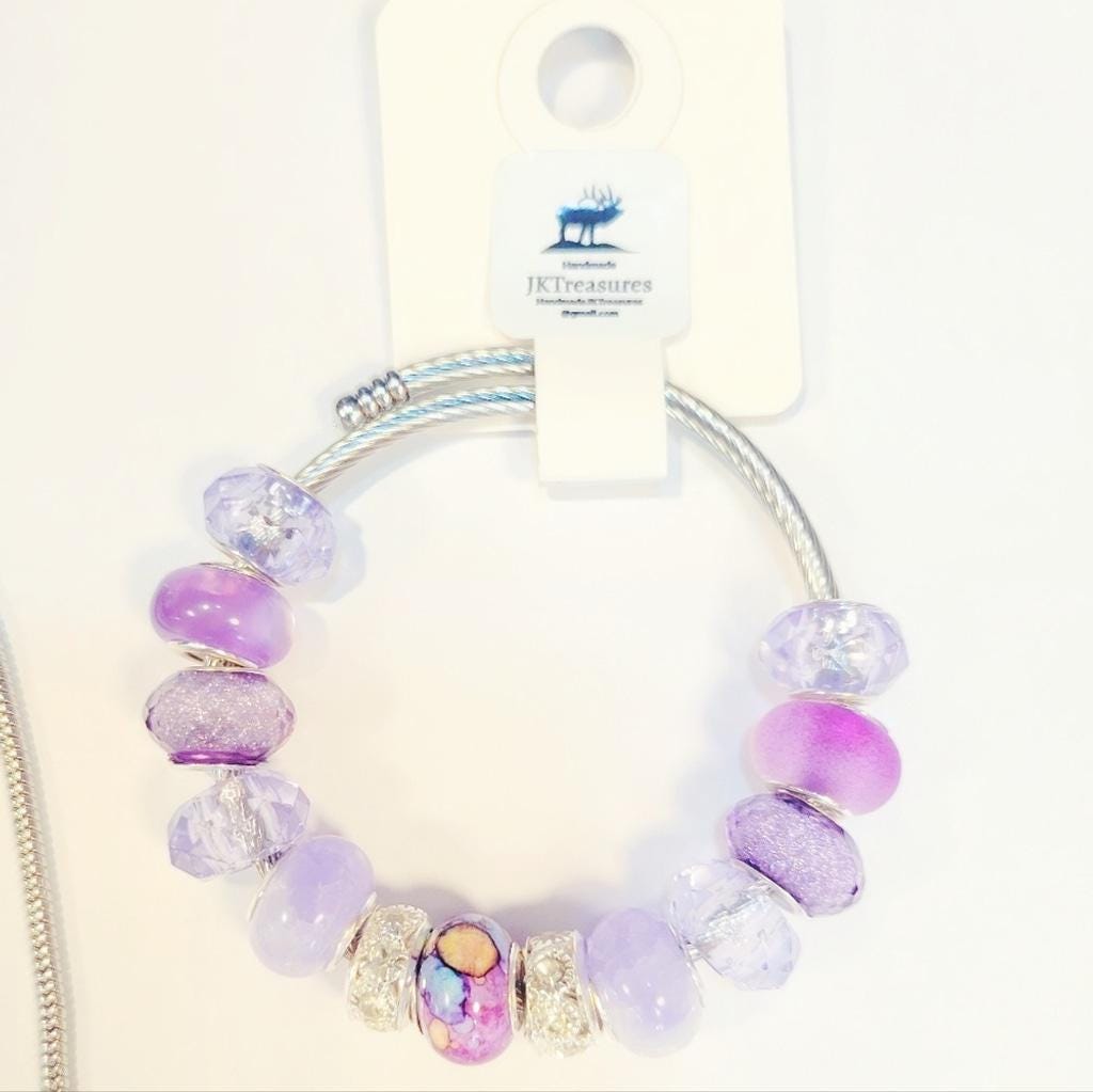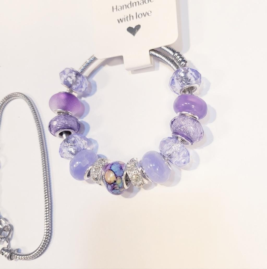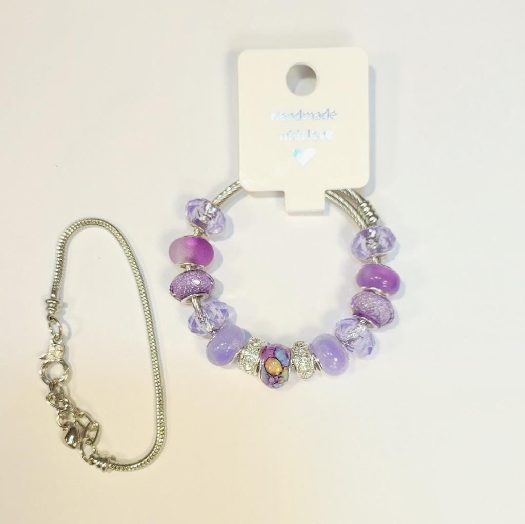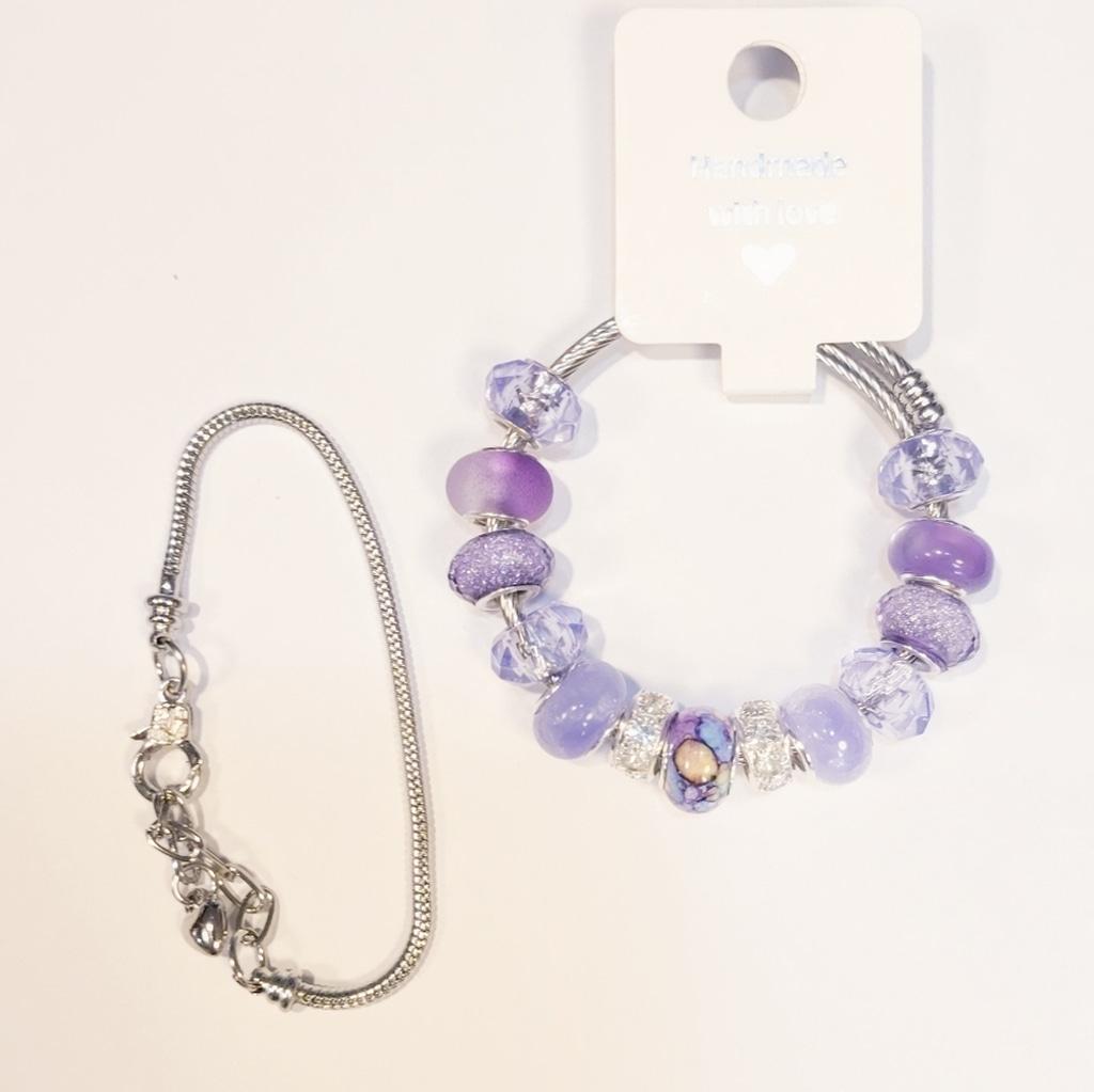 This elegant charm bracelet features a stunning combination of purple hues, perfect for adding a touch of sophistication to any outfit. The intricate design and vibrant colors make it a must-have accessory.