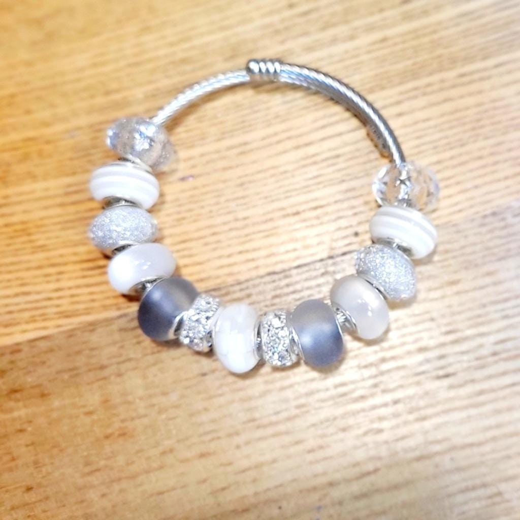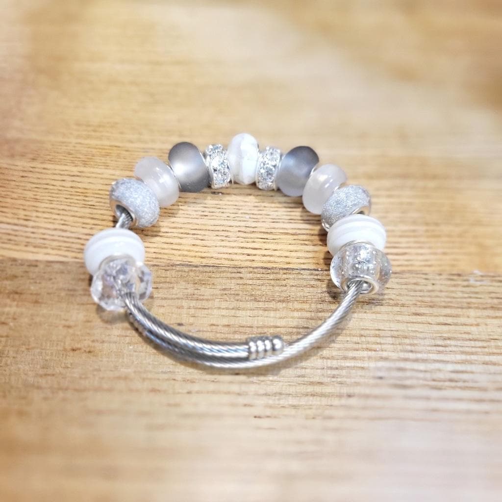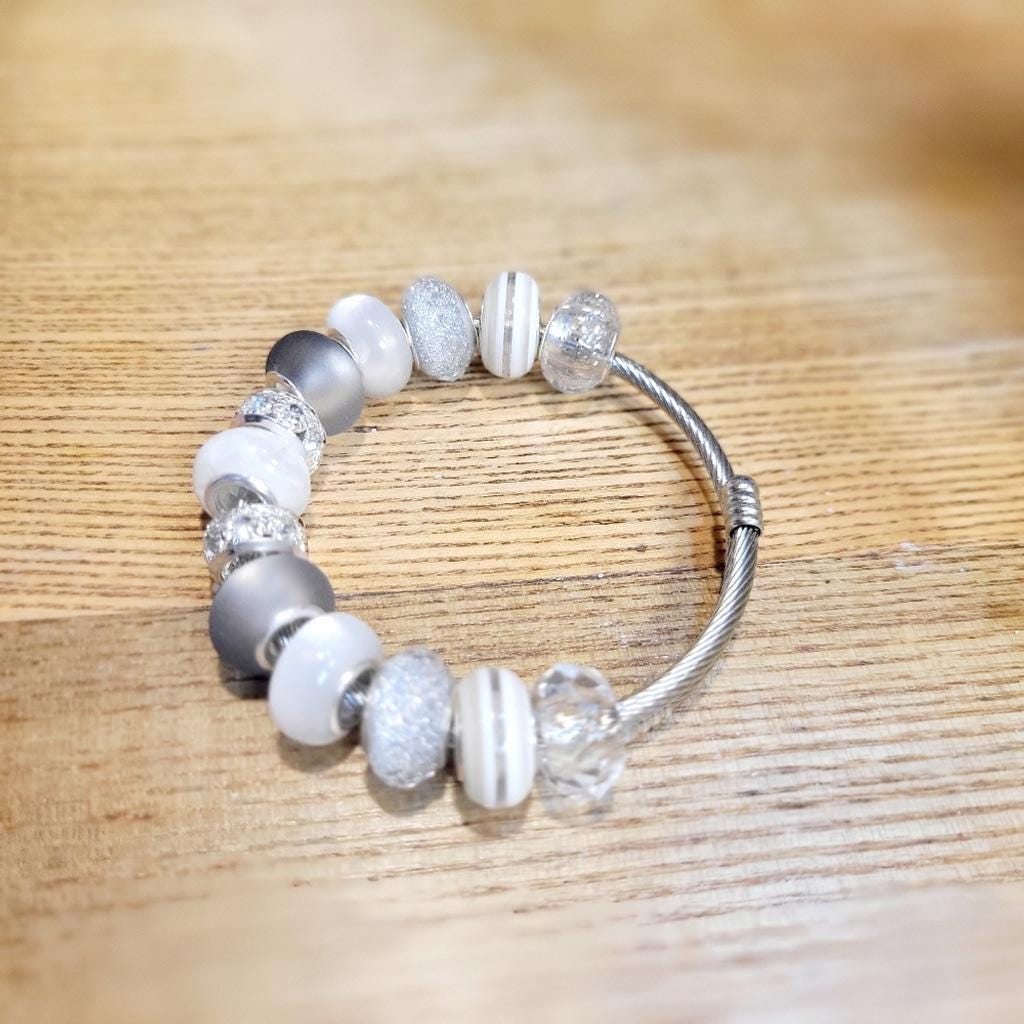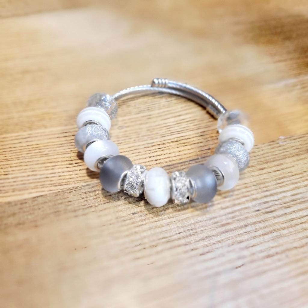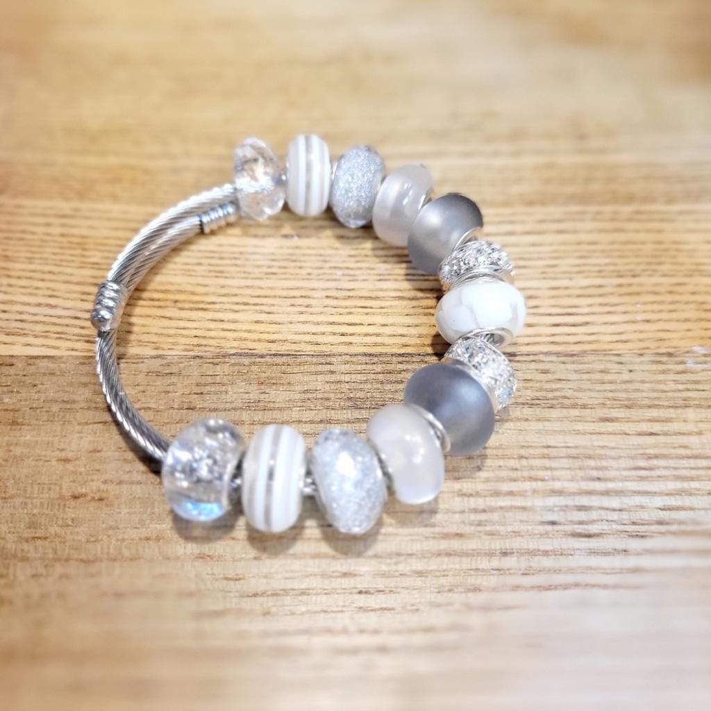 This elegant artisanal bracelet features a stunning combination of large hole silver and white beads, on an expandable 7" snake coil silver bracelet, perfect for any occasion. Its sophisticated design adds a touch of class to your outfit.