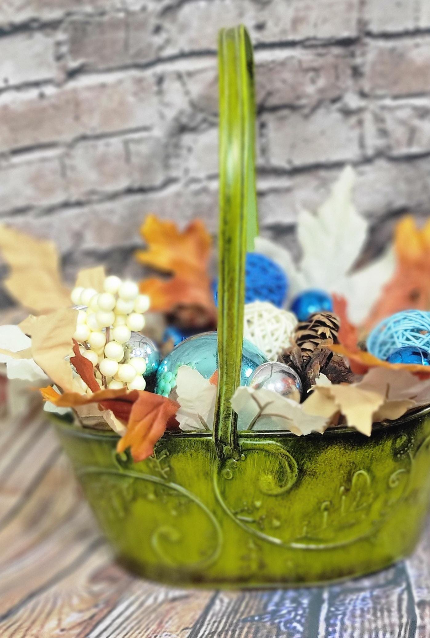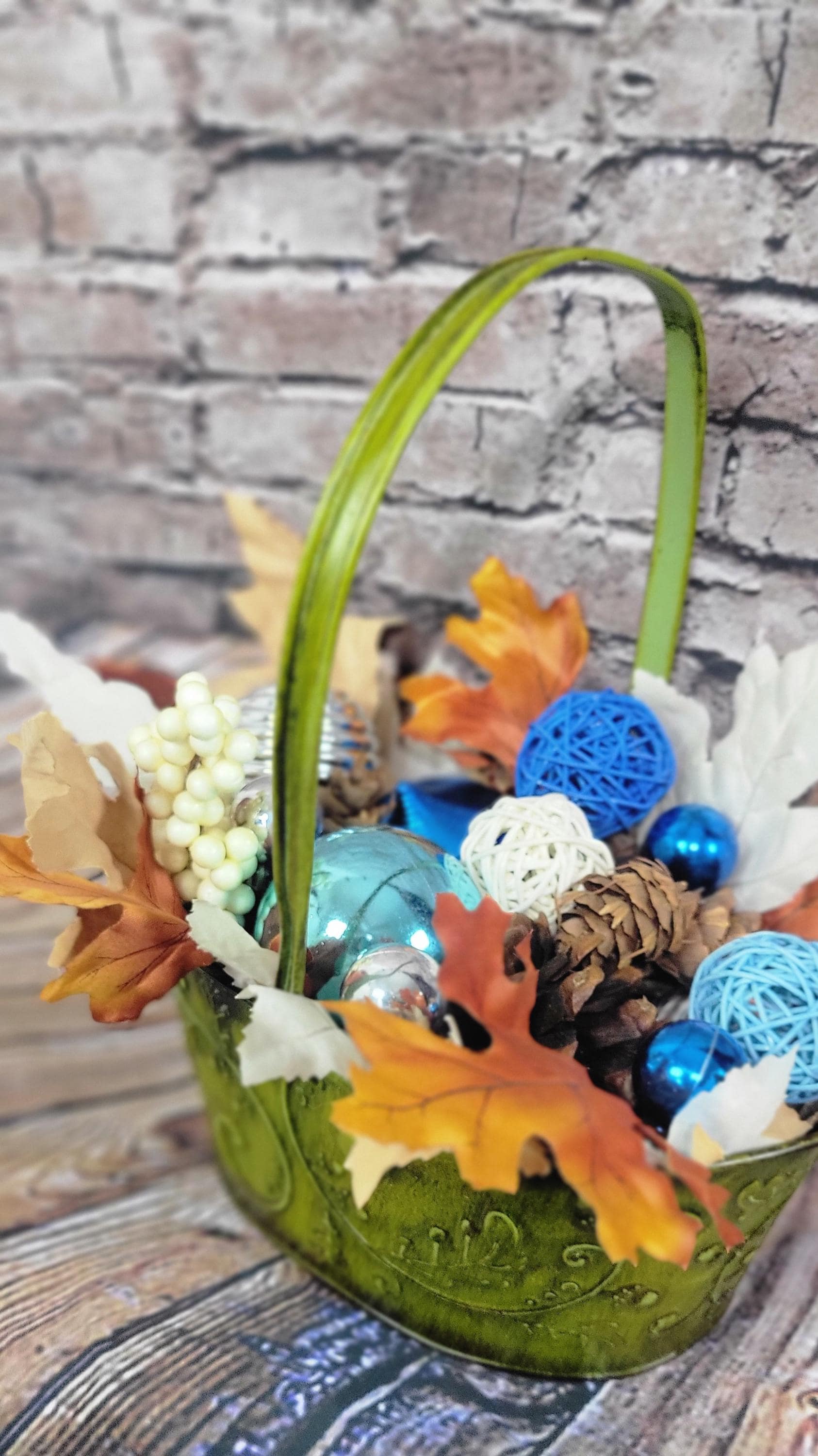 Hand crafted metal green basket, filled with scented pinecones, mini pinecones, faux fall leaves, and blue and silver shatterproof ball ornaments. The measurements are approximately 8" l x 12" h x 4" w. The contents are glued inside of the basket.