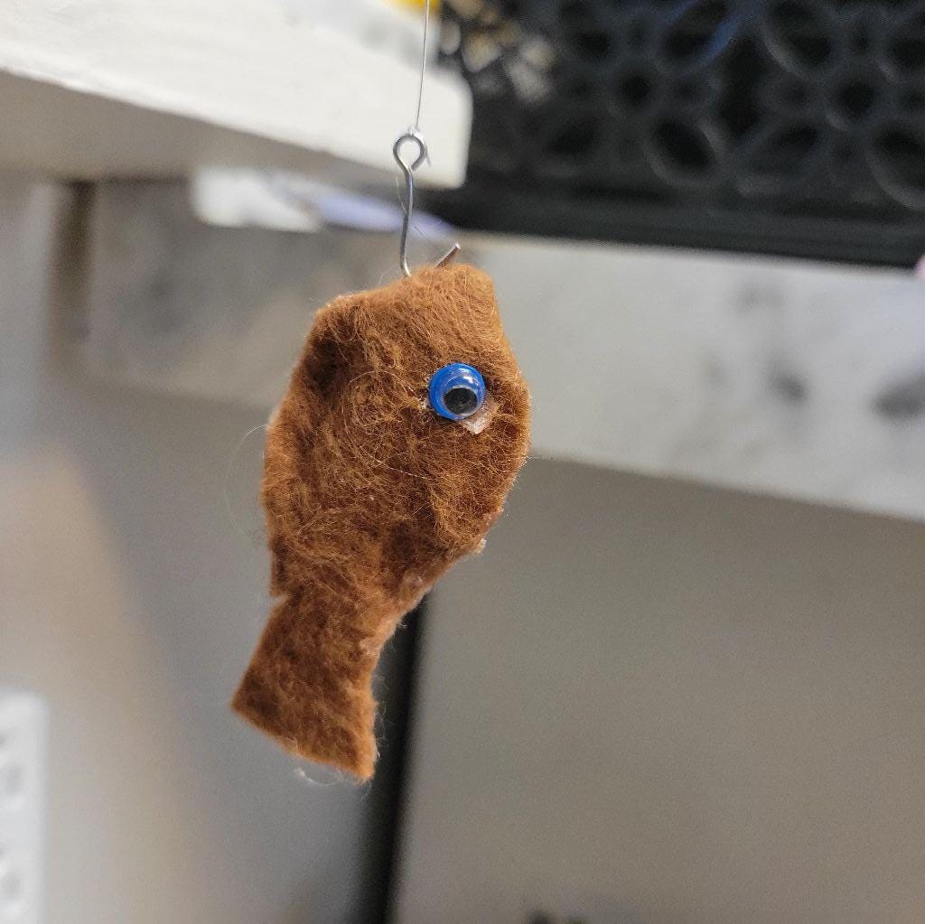 Meet Rispin Hooktwist, this charming gnome is hand crafted with love. He has a long gray beard and black body and fishing hat, with a silver fish hook, wearing a deep blue sweater. He has a steel bucket in his left hand and a working fishing pole with a caught fish in his right hand. Perfect for garden decor, Rae Dunn Collection, or tier Tray Decor. He measures approximately 8" tall.