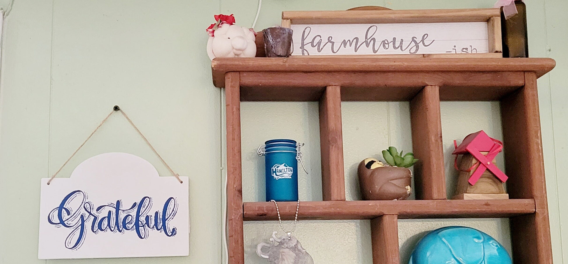 Handpainted 6x8" wood sign in white chalk paint with "Grateful" painted in a vibrant blue, with a twine to hang it from in your room of choice.