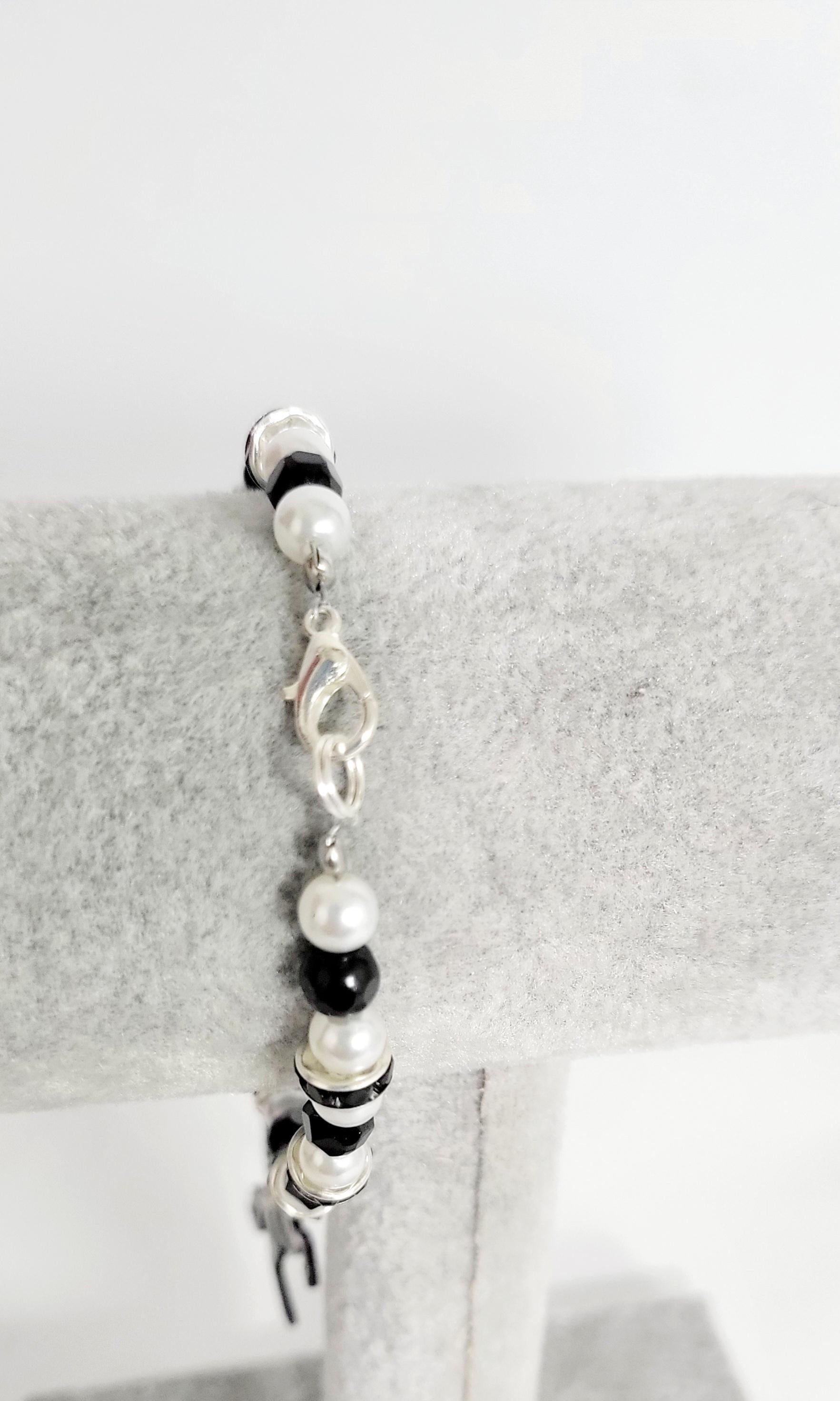 This elegant bracelet is hand crafted with black and white beads, black rhinestones featuring a unique unicorn skeleton charm in a charm holder, with a lobster clasp. Measurements are approximately 7.5".