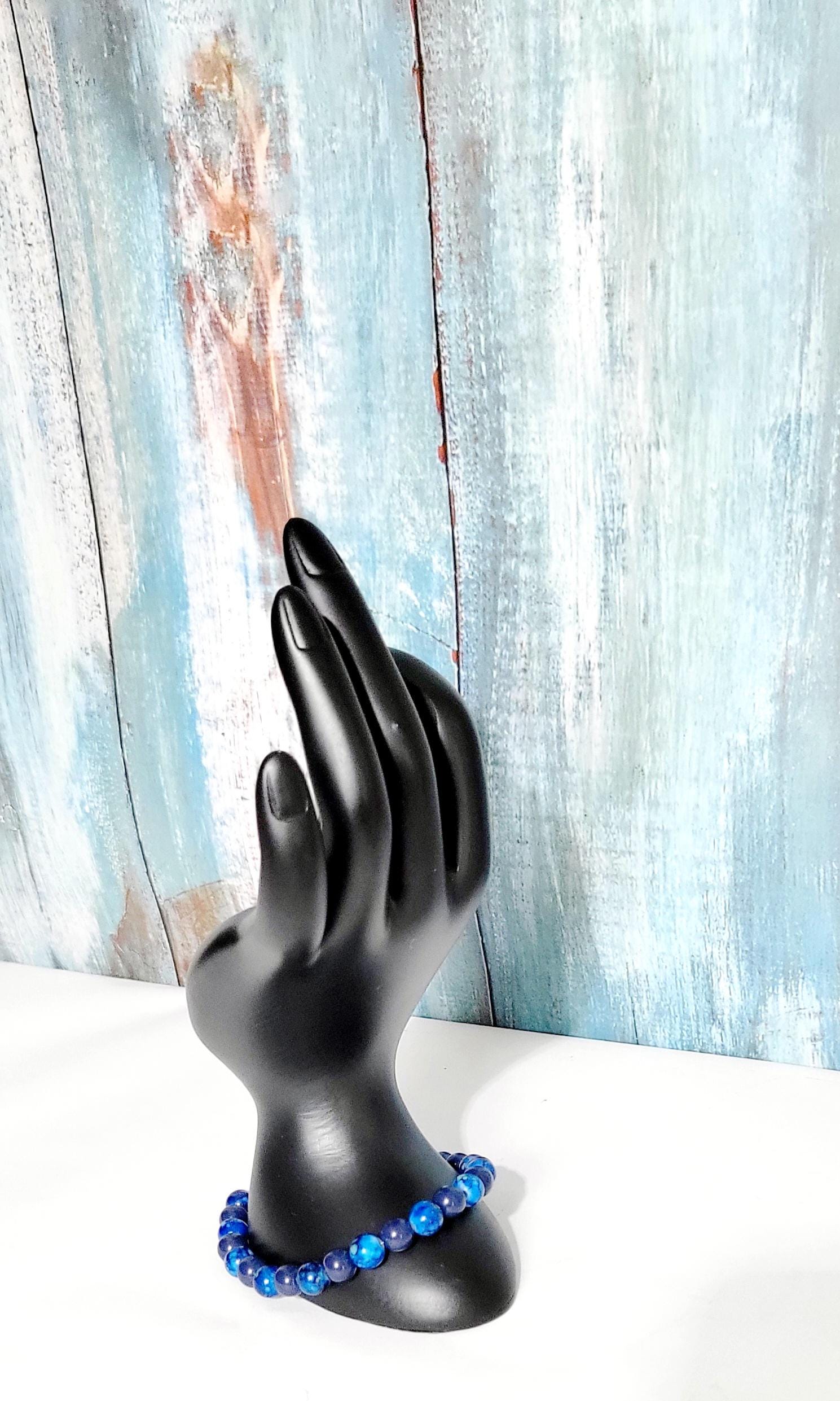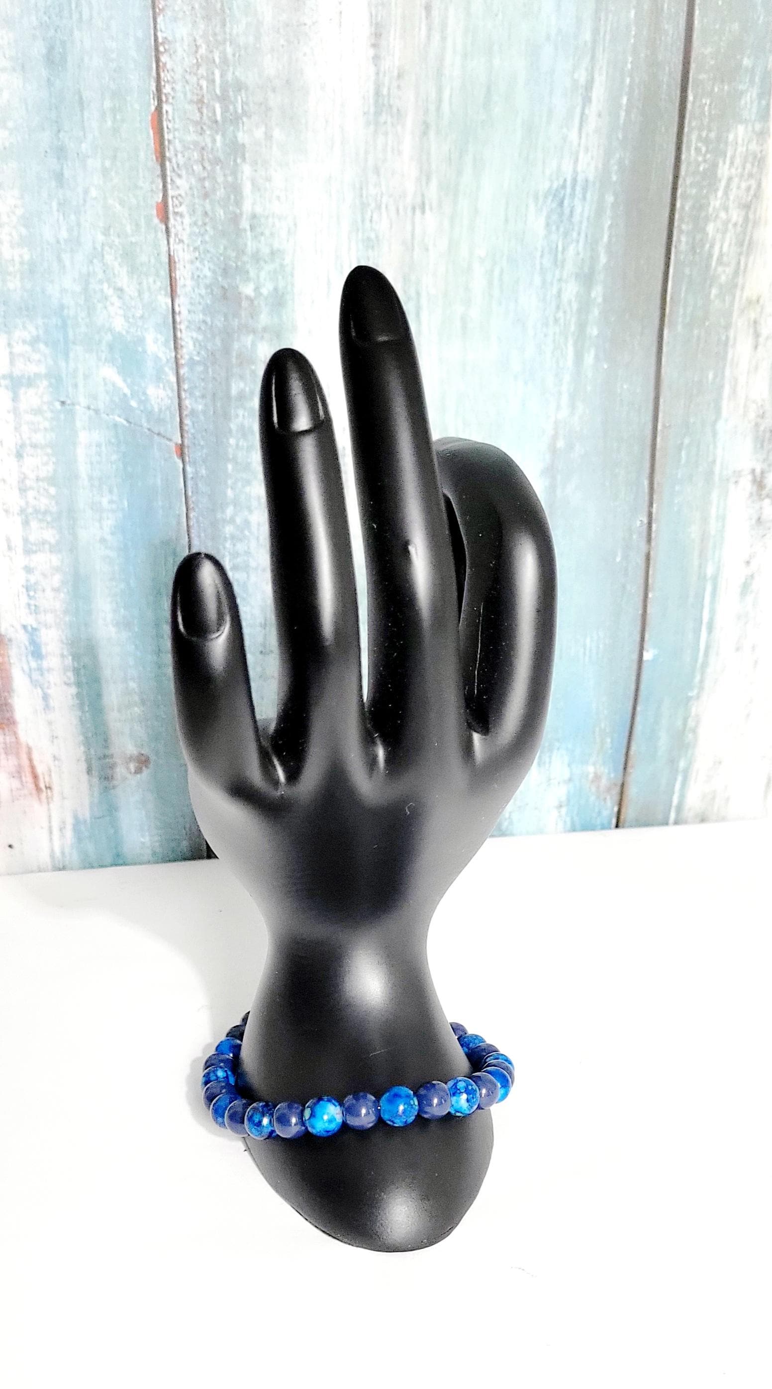 Hand crafted dark blue with white acrylic beads and dark blue glass beaded bracelet with a lobster clasp. Measurements are approximately 7.5".