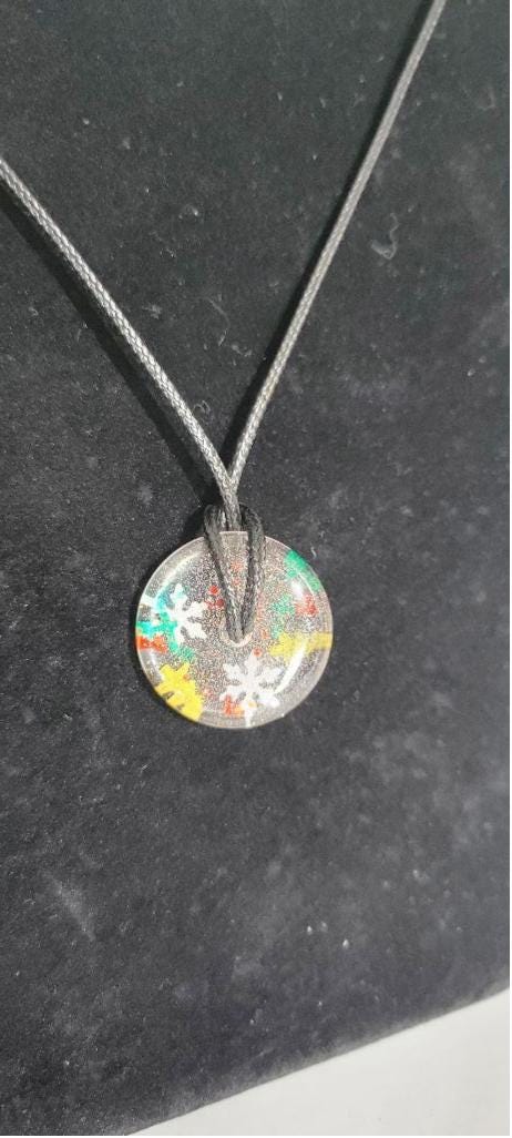 Handcrafted resin medallion with a Christmas theme, with snowflakes and trees embellishments, and glitter, hung on a corded, adjustable necklace, with a lobster clasp.Measurements are approximately .75" medallion on a 7" corded necklace, with a 2" extension.
