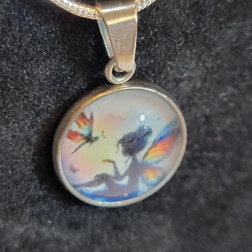Hand crafted 10 mm stainless steel metal tray with a fairy themed cabochon, hung on an 18" sterling silver chain, with a lobster clasp.