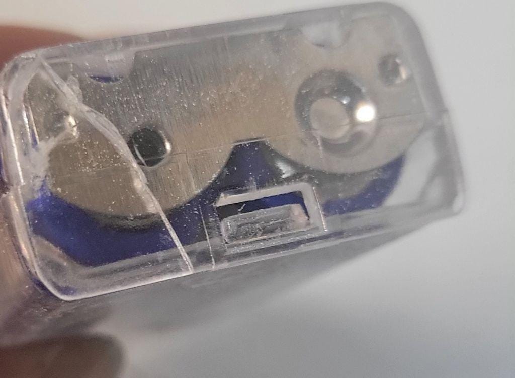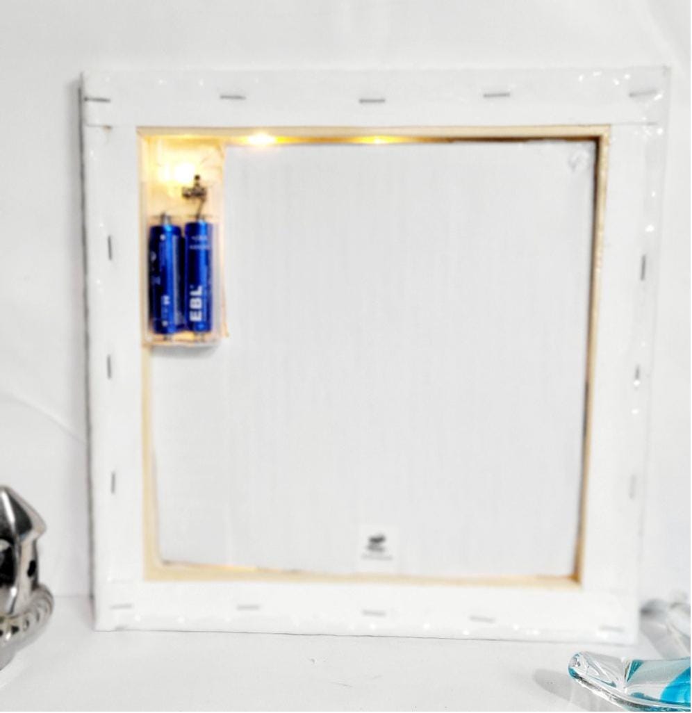 A handpainted mermaid in purple and blue, with glitter to highlight her tail and the water bubbles, with crushed glass to add dimension (warning: there are a few high points of glass), covered in resin, and lit from behind with a string of battery operated fairy lights. The lights are new but the casing was cracked during production.