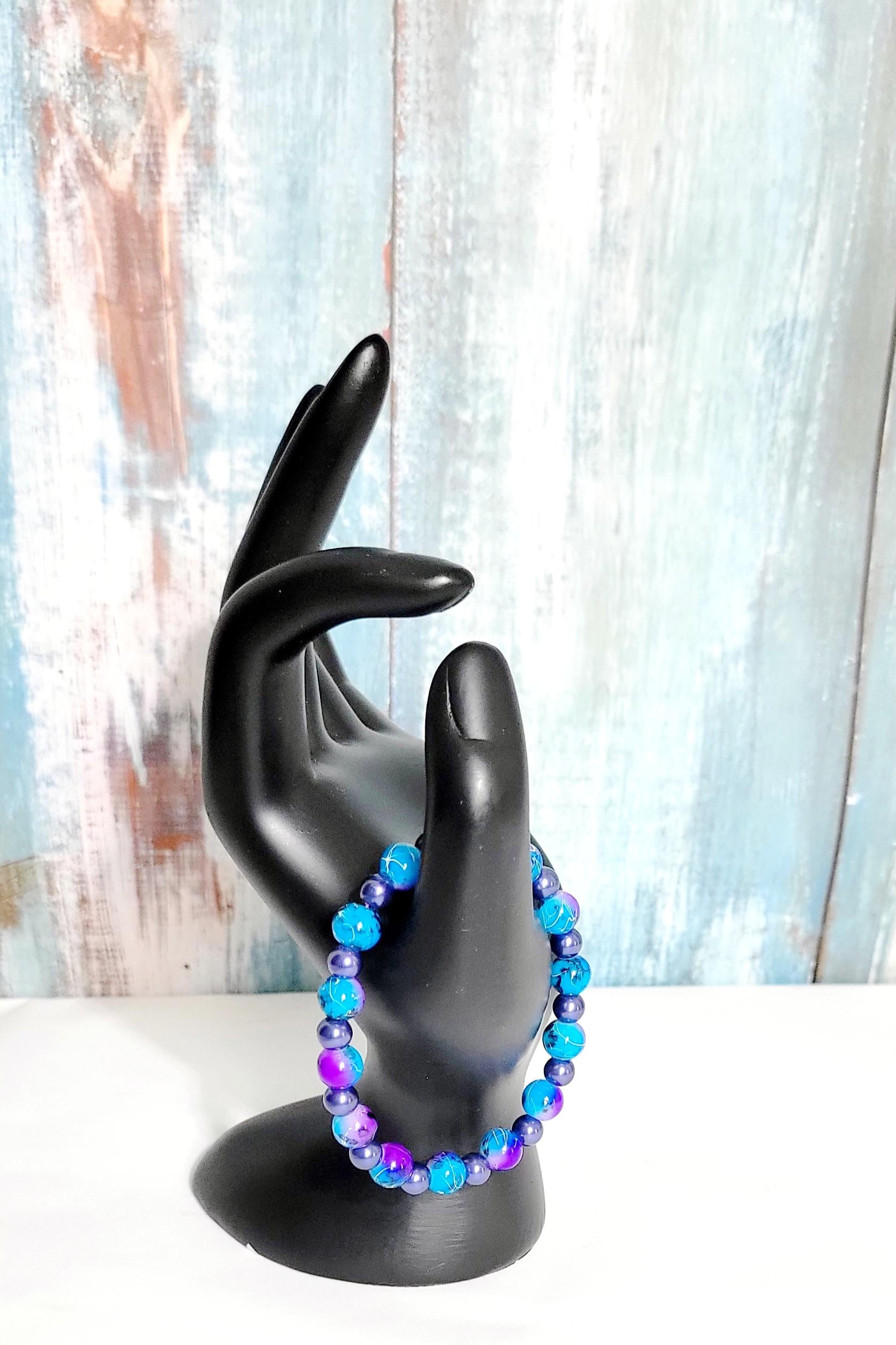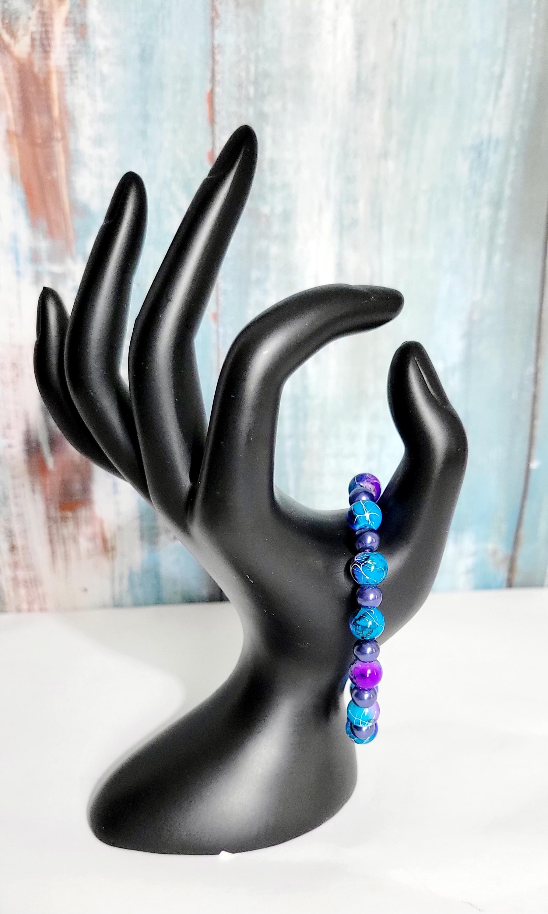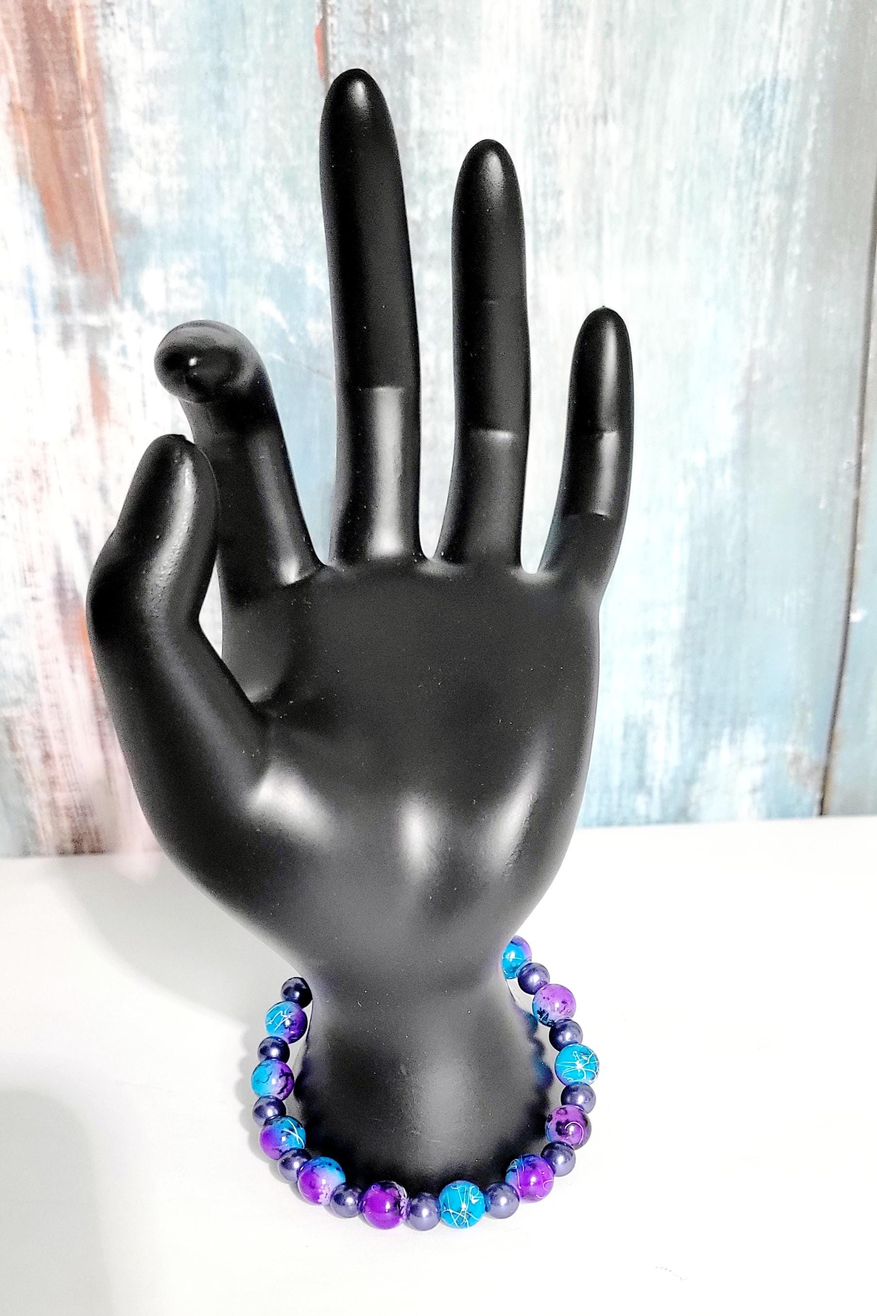 Hand crafted dark blue and purple acrylic beads and dark purple glass beaded bracelet on a purple stretchy cord. Measurements are approximately 7.5".