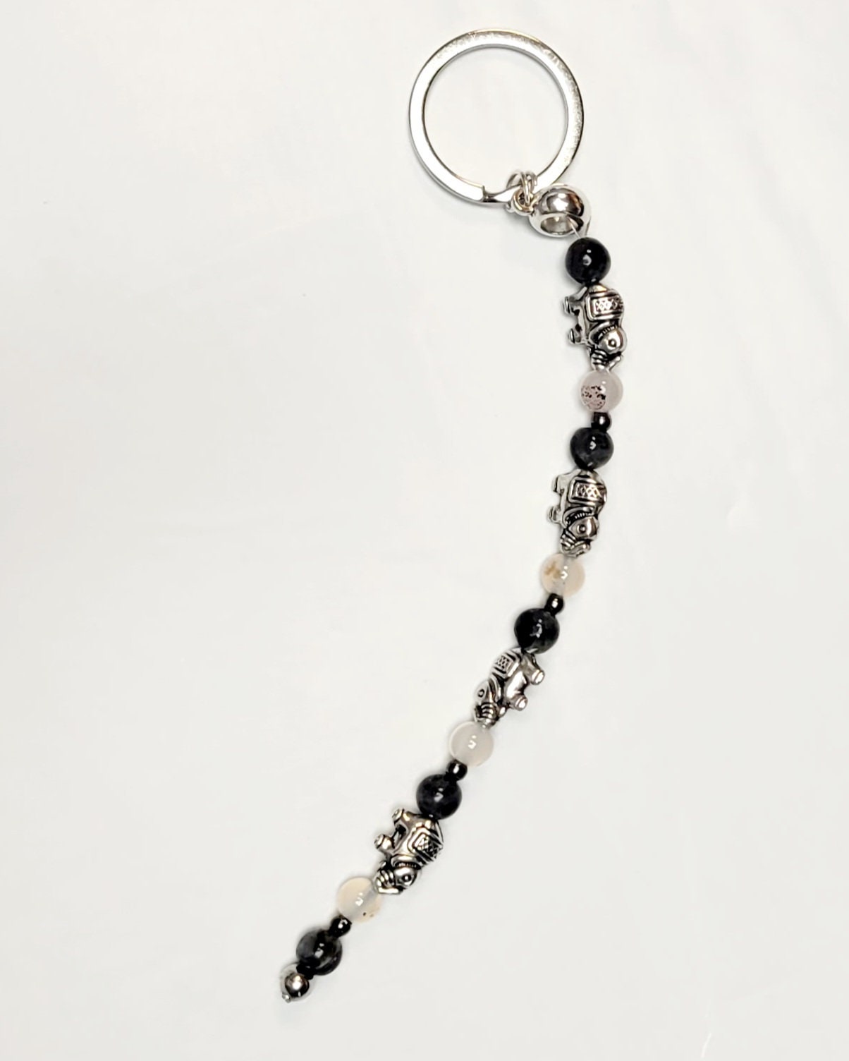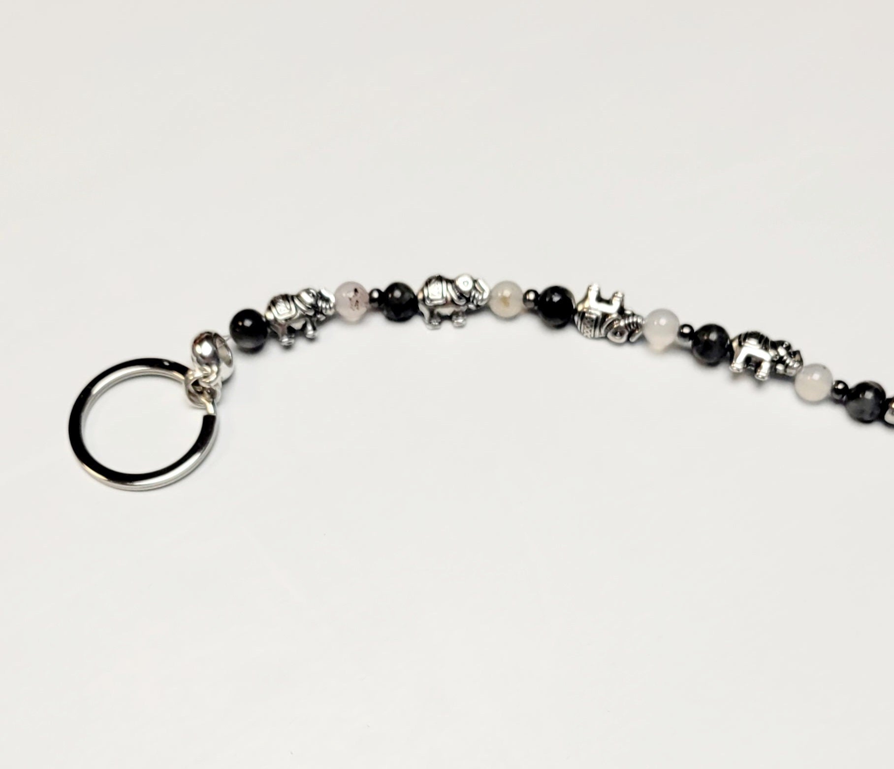 Handmade with glass beads in black and white, with Tibetan silver elephant spacers and beads, on a doubled steel wire, keychain. Measures approximately 5.5"