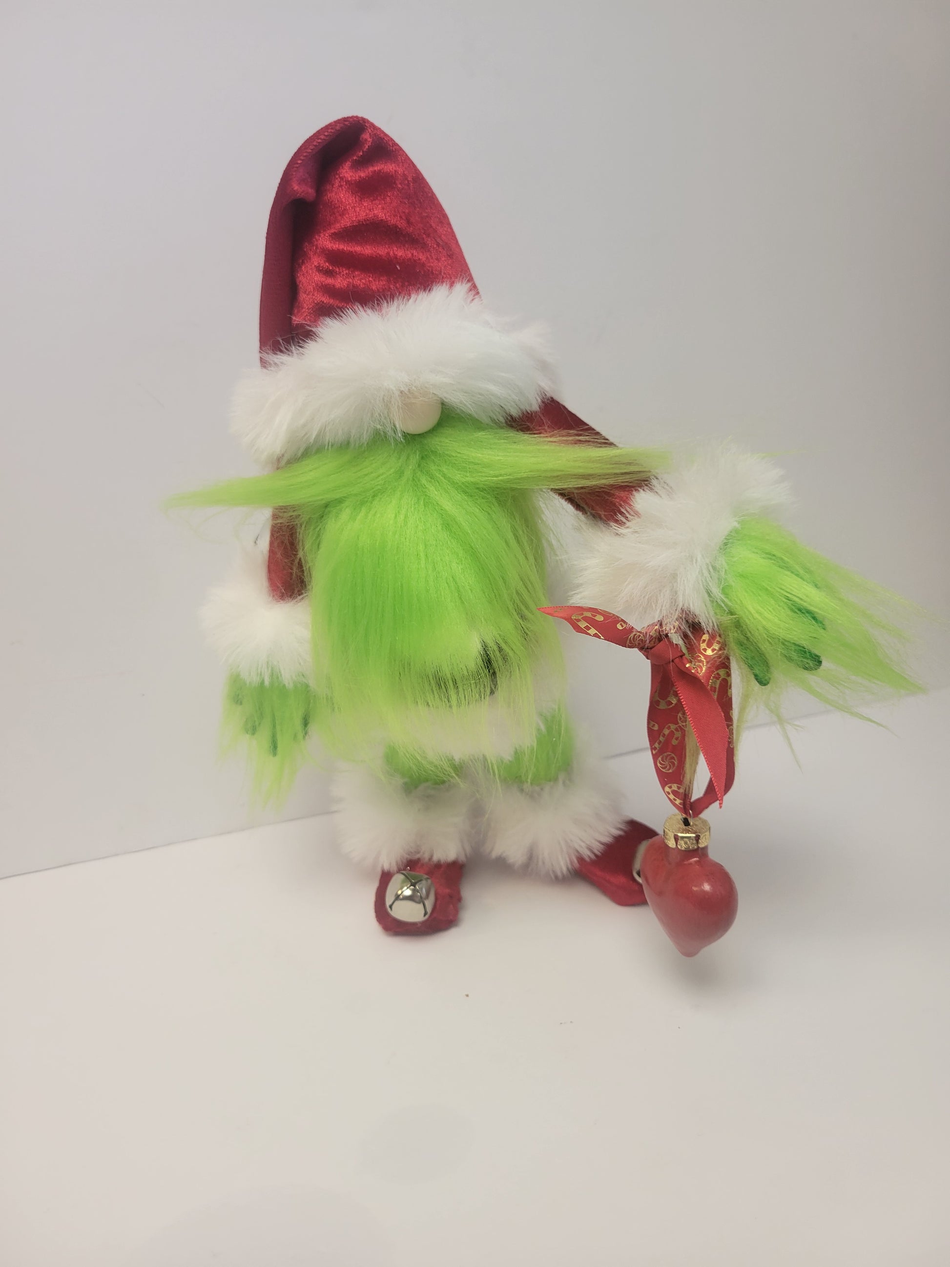 Handmade Grinch Santa Gnome, 18.5" Holiday Decor, Luxury Velvet & Faux Fur with Hand-Painted Heart Ornament