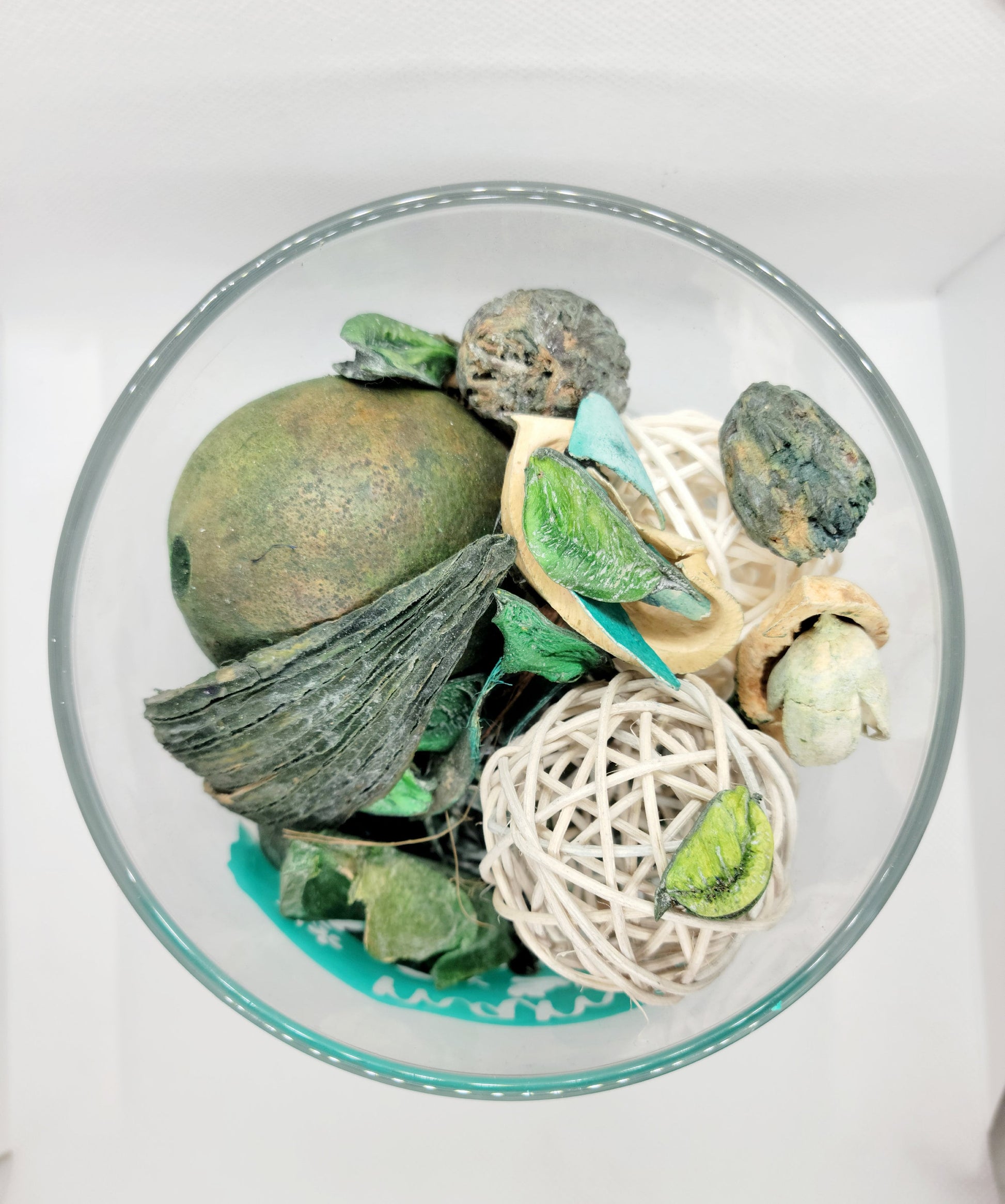 Handpainted "Mama" bear on a glass jar in turquoise. Great for a candle, potpourri, or other small objects. Measurements are approximately 12" circumference and 3.75" tall. Potpourri not included.