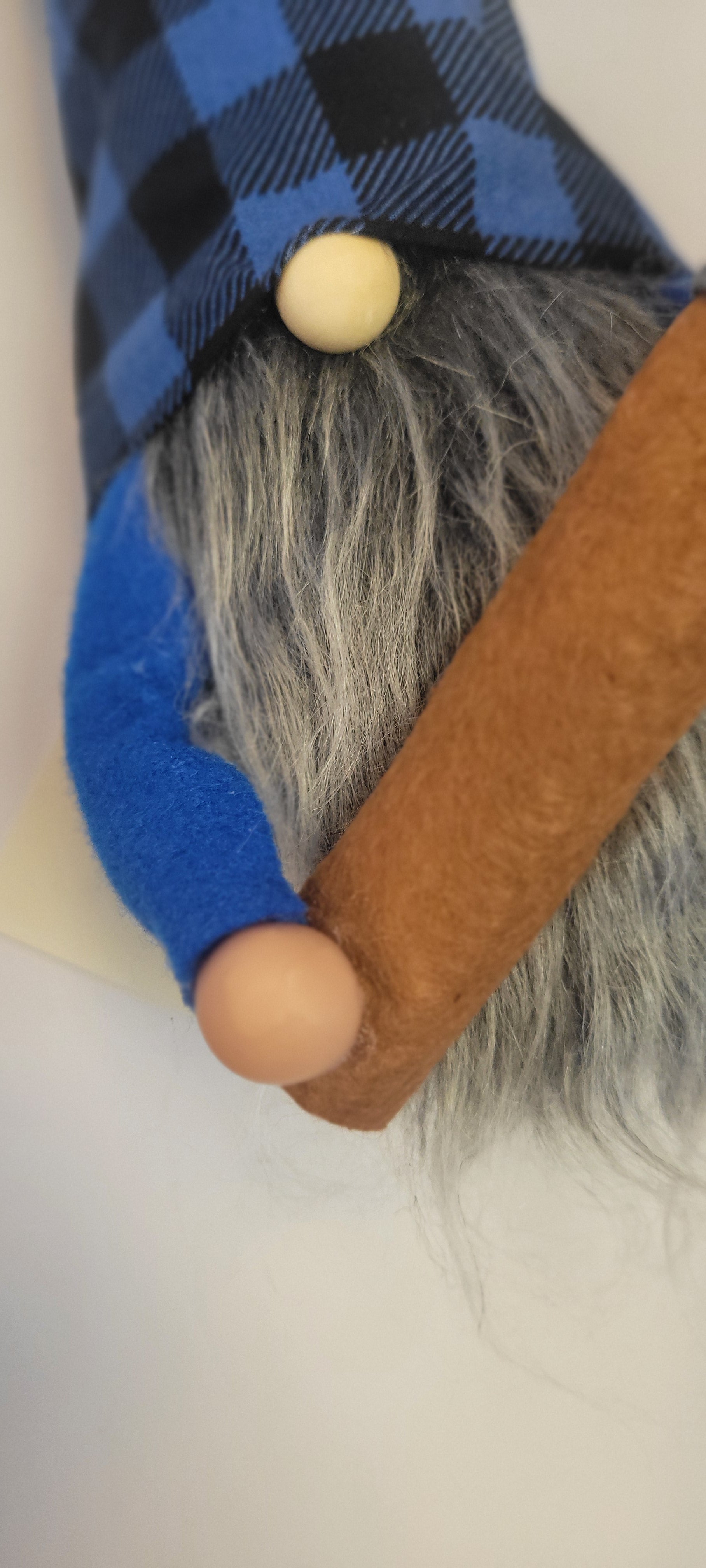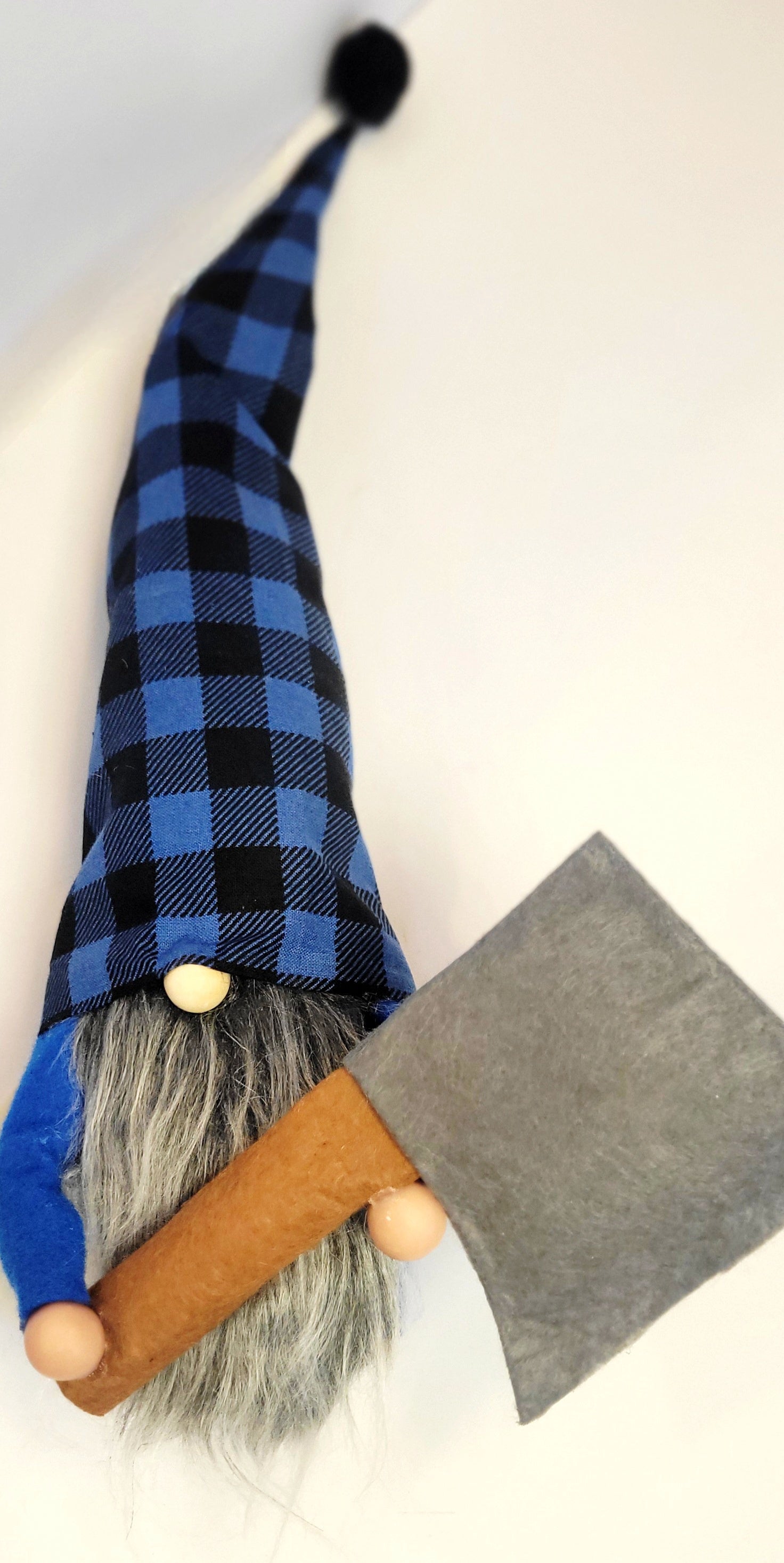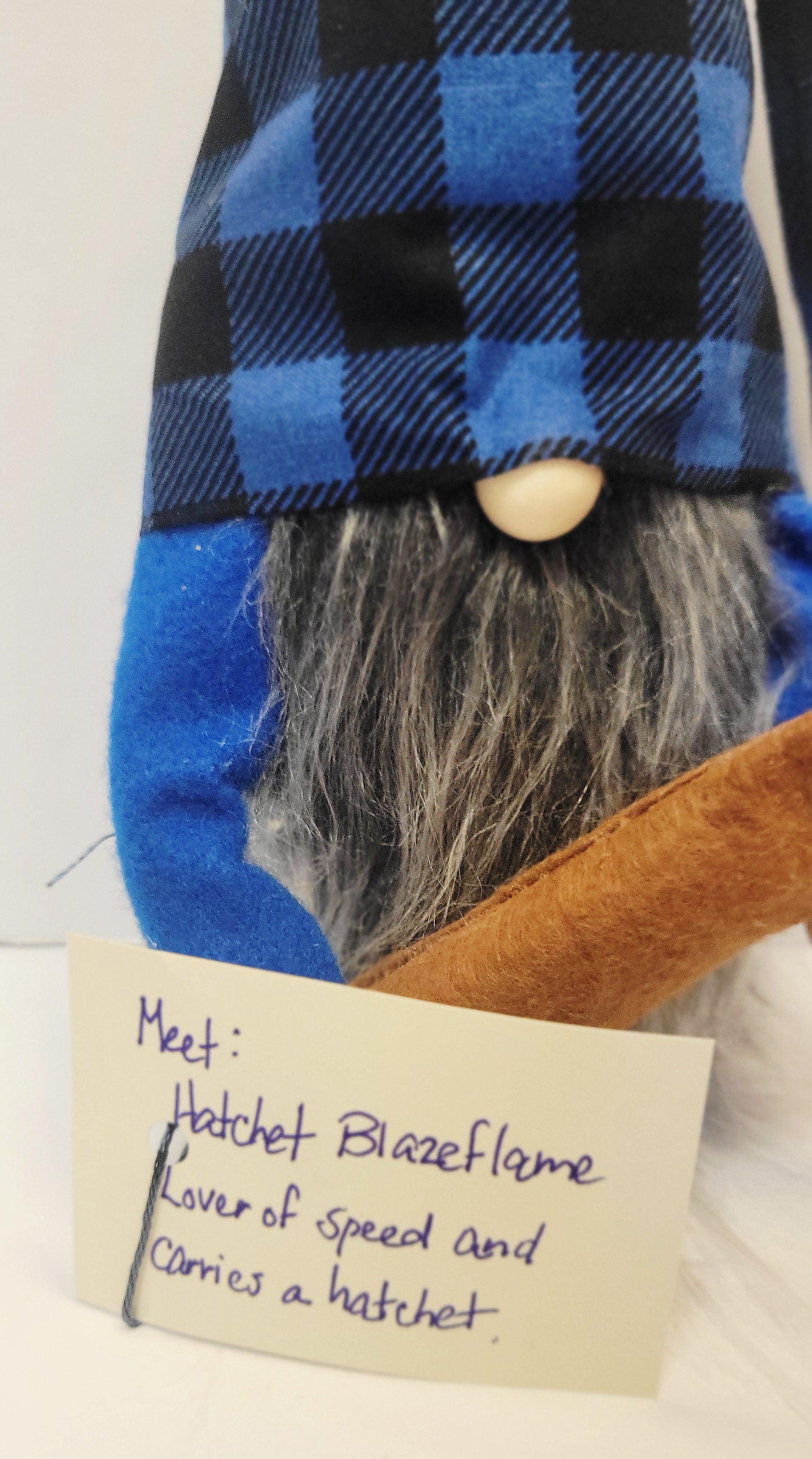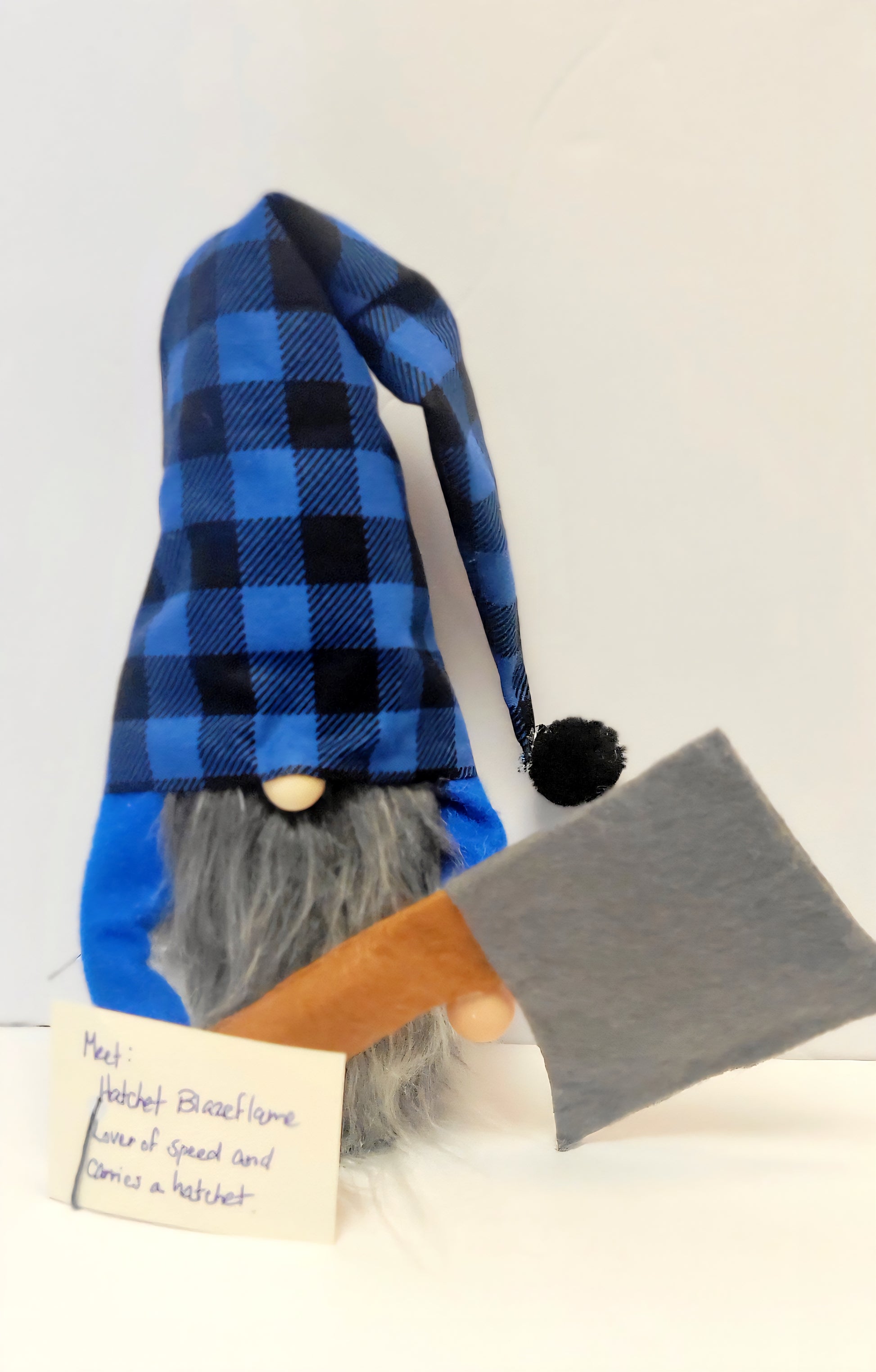 Hatchet is handmade with love and premium materials. He stands 6" tall, 16" to the tip of his blue and black plaid hat, with a matching black pompom. He is weighted with rice and poly-fil, with a bright blue felt top, poseable arms, clay hands, holding a 6.5" felt hatchet. He has a wood nose and a long, flowing Mongolian gray beard made from faux fur.