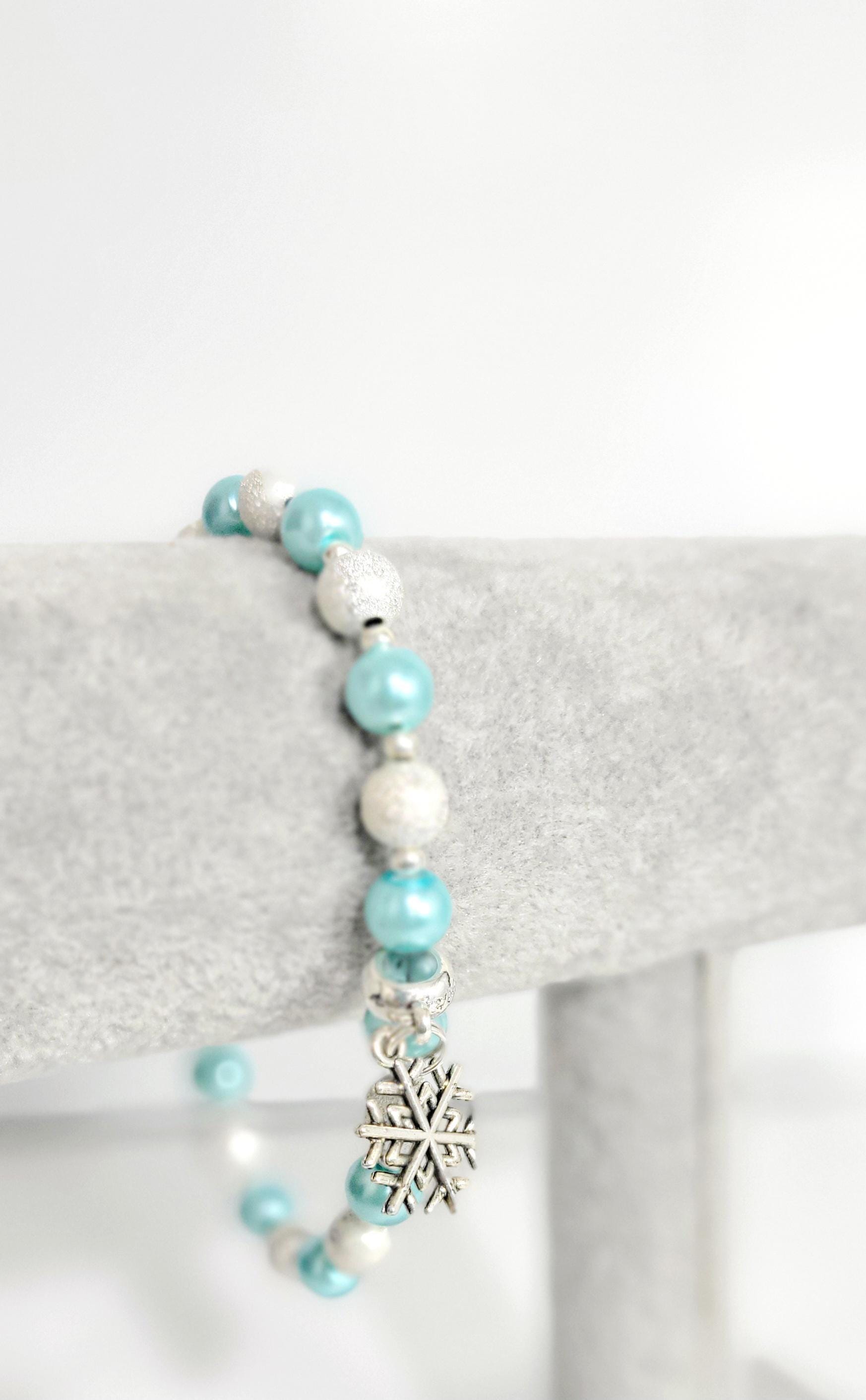 Ice blue glass beaded snowflake charm bracelet
