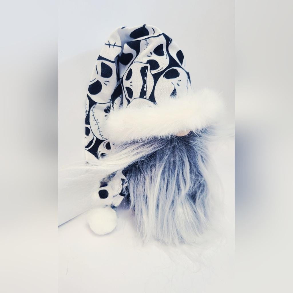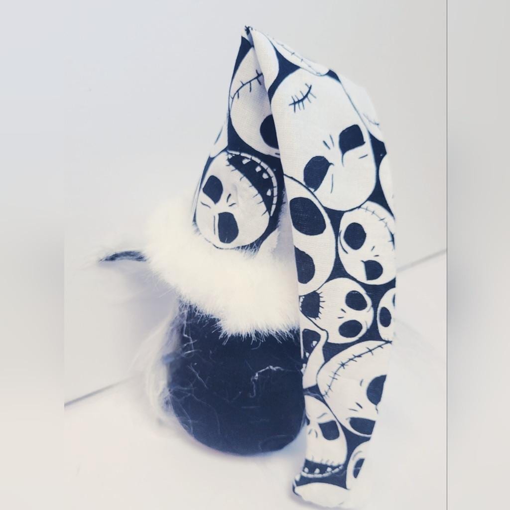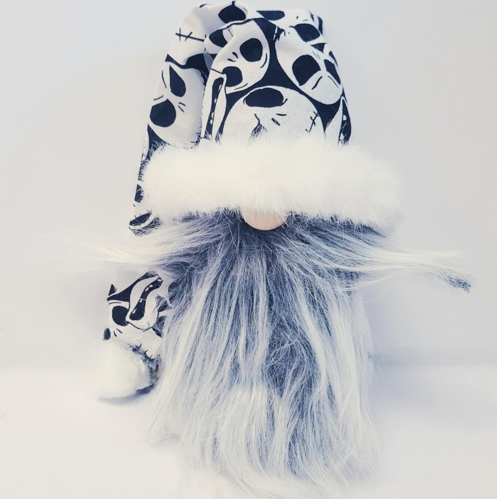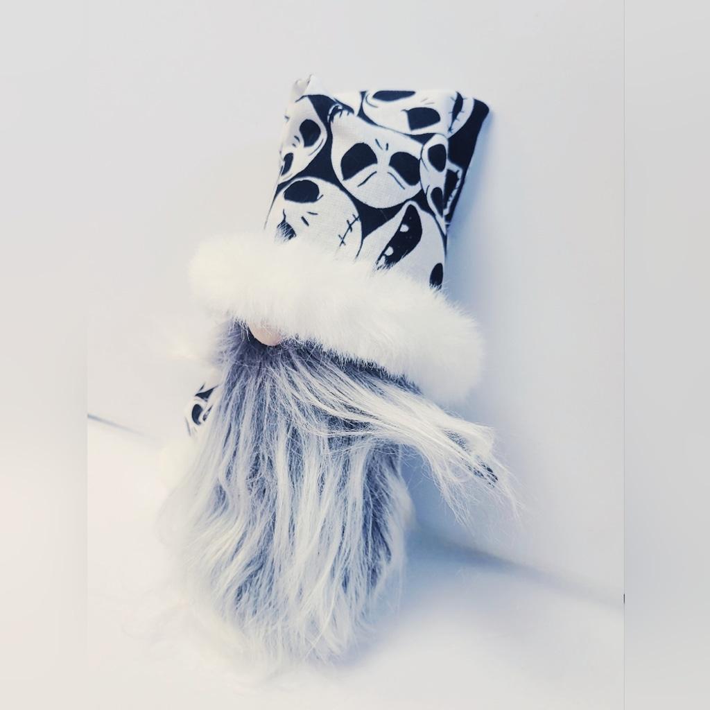 Hand crafted Jack Skellington gnome from the 1993 movie, The Nightmare Before Christmas. Jack measures approximately 3" wide x 8" tall and 16" tall to the tip of his white pom pom tipped hat.