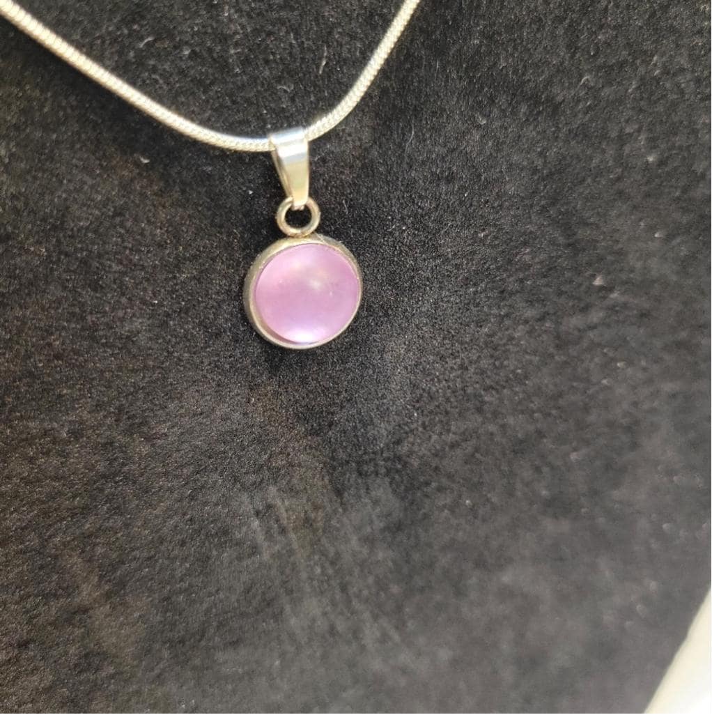 Hand crafted light pink crystal rhinestone set on a 10 mm stainless steel bezel, strung on an 18" 925 stamped sterling silver chain.