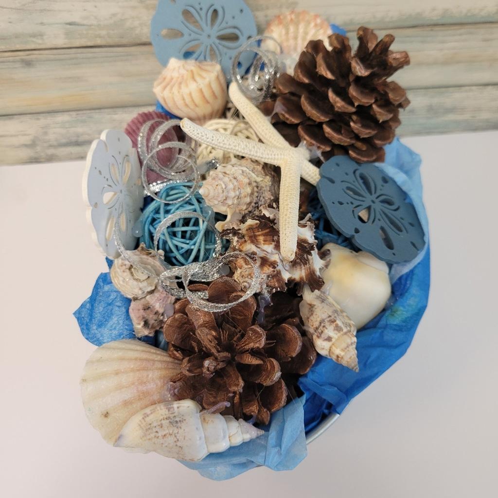 Bring a touch of the sea to your home with this charming decorative basket, with Meet Me By The Sea on both sides. Featuring 2 tones of blue tissue paper, scented pinecones, sea shells of various types, a finger starfish, faux sand dollars, and silver curly ribbon, it's perfect for adding a whimsical accent to any room. Measurements are approximately 7.5x6x9".