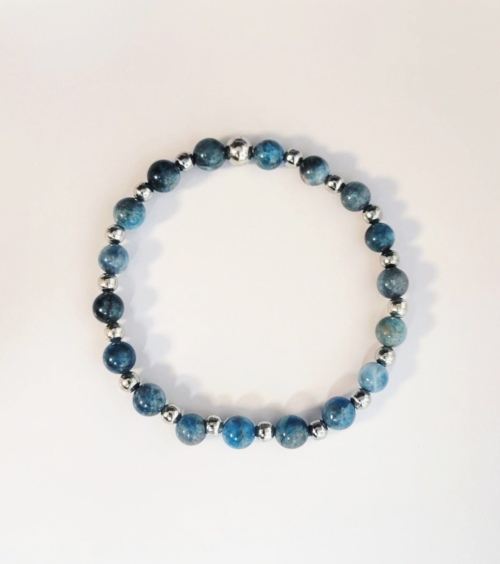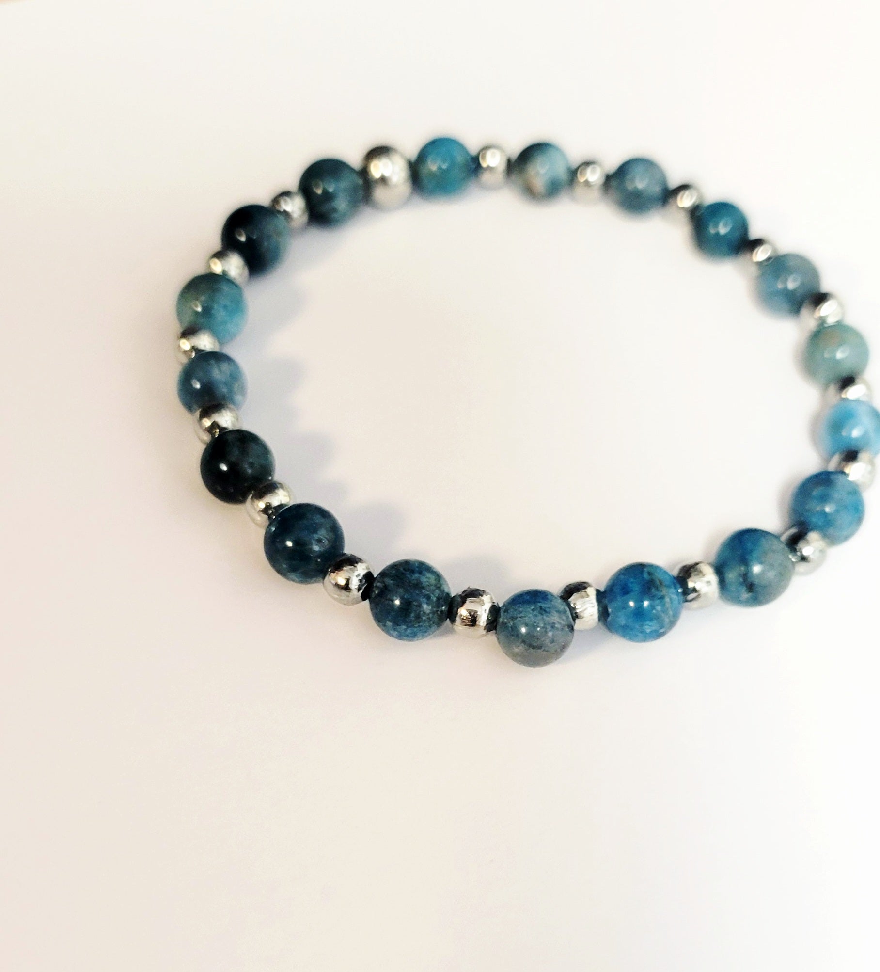 Handmade natural gemstone 6mm blue apatite dainty beaded bracelet with stainless steel spacers. Fits 7" wrist best. Please remember to roll the bracelet over your hand to help the longevity of the stretch cord.