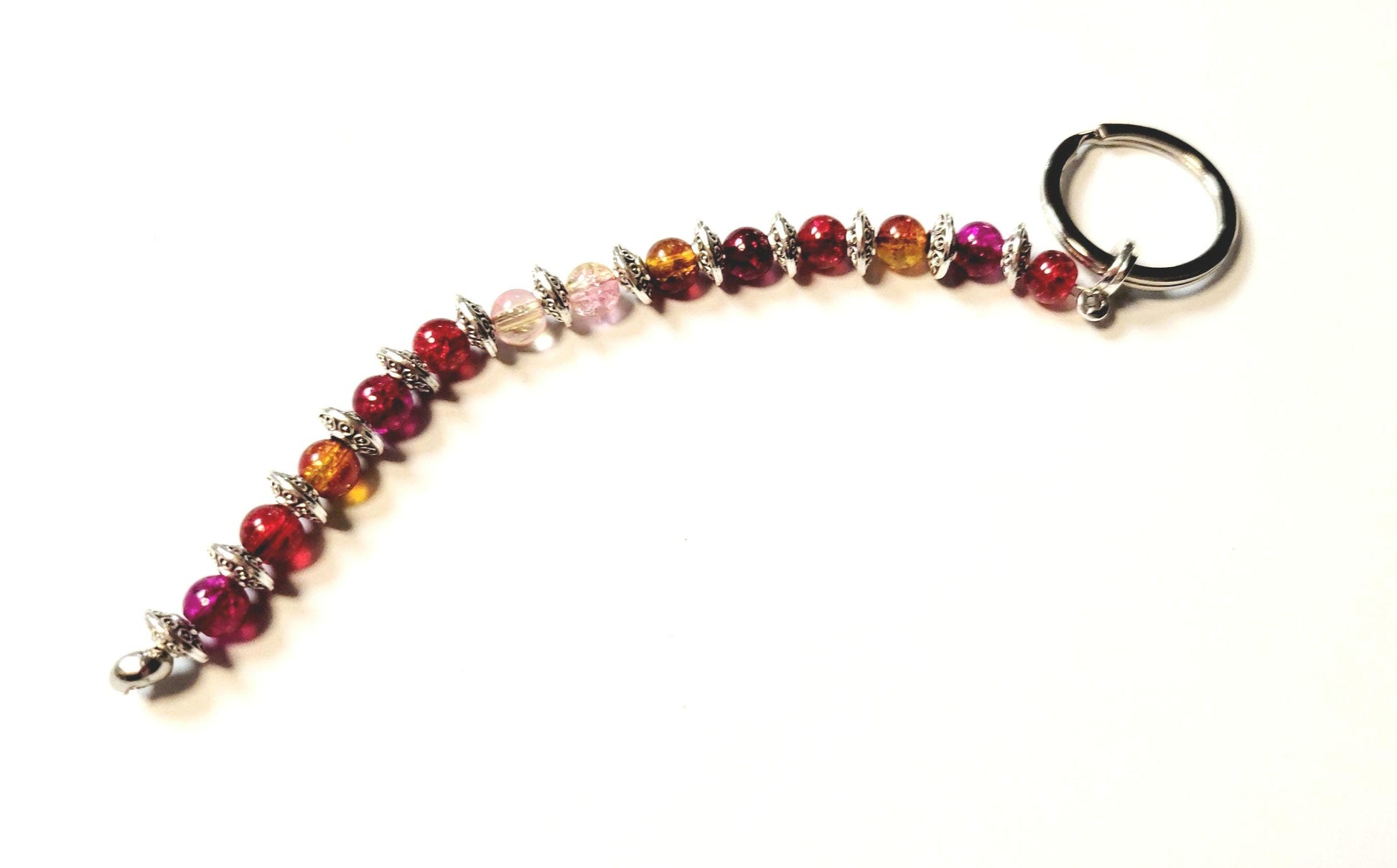 Handmade with glass beads in red, purple, and orange, with metal spacers, on a doubled steel wire, keychain. Measures approximately 5.5"