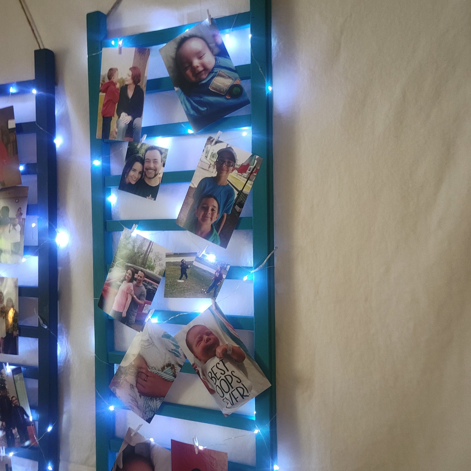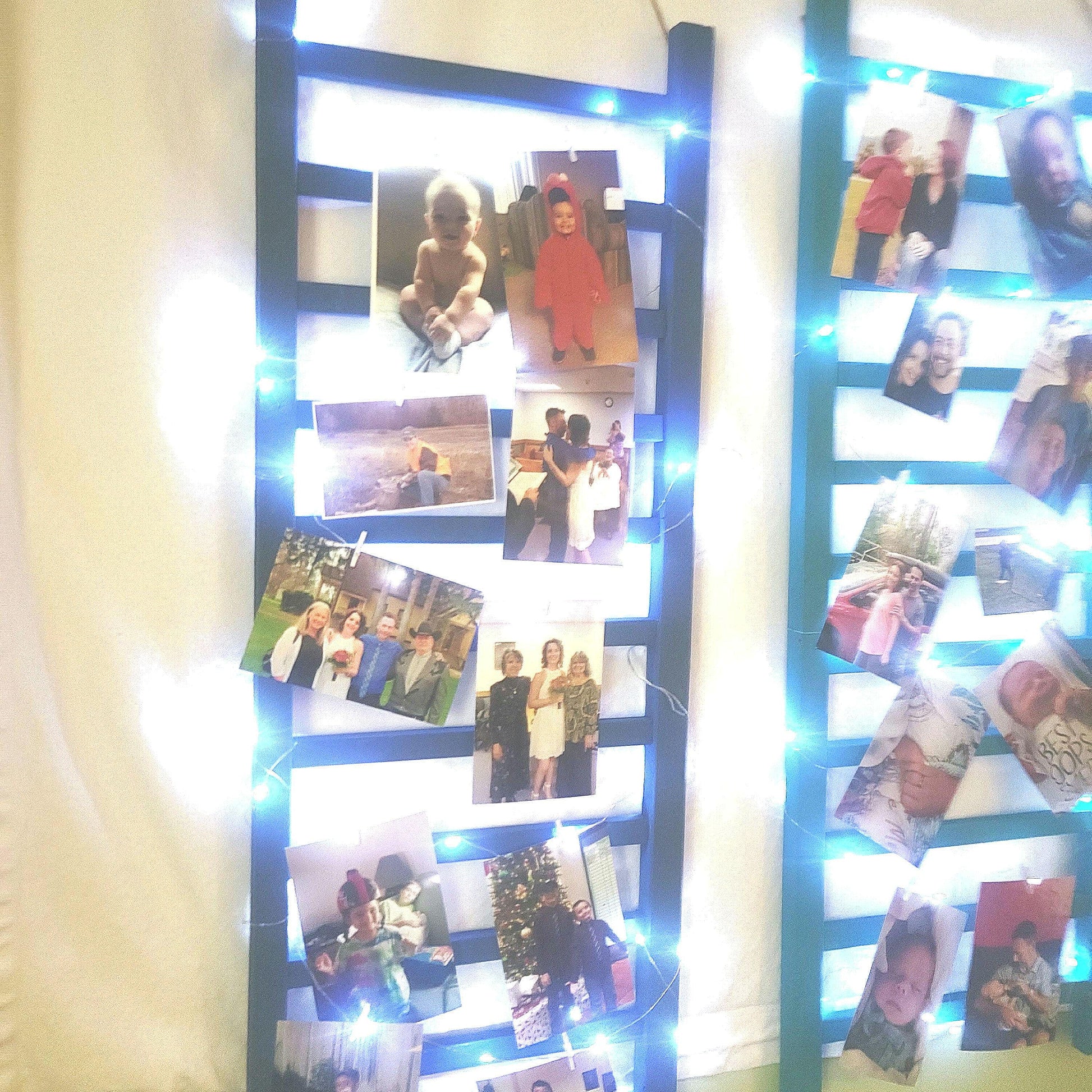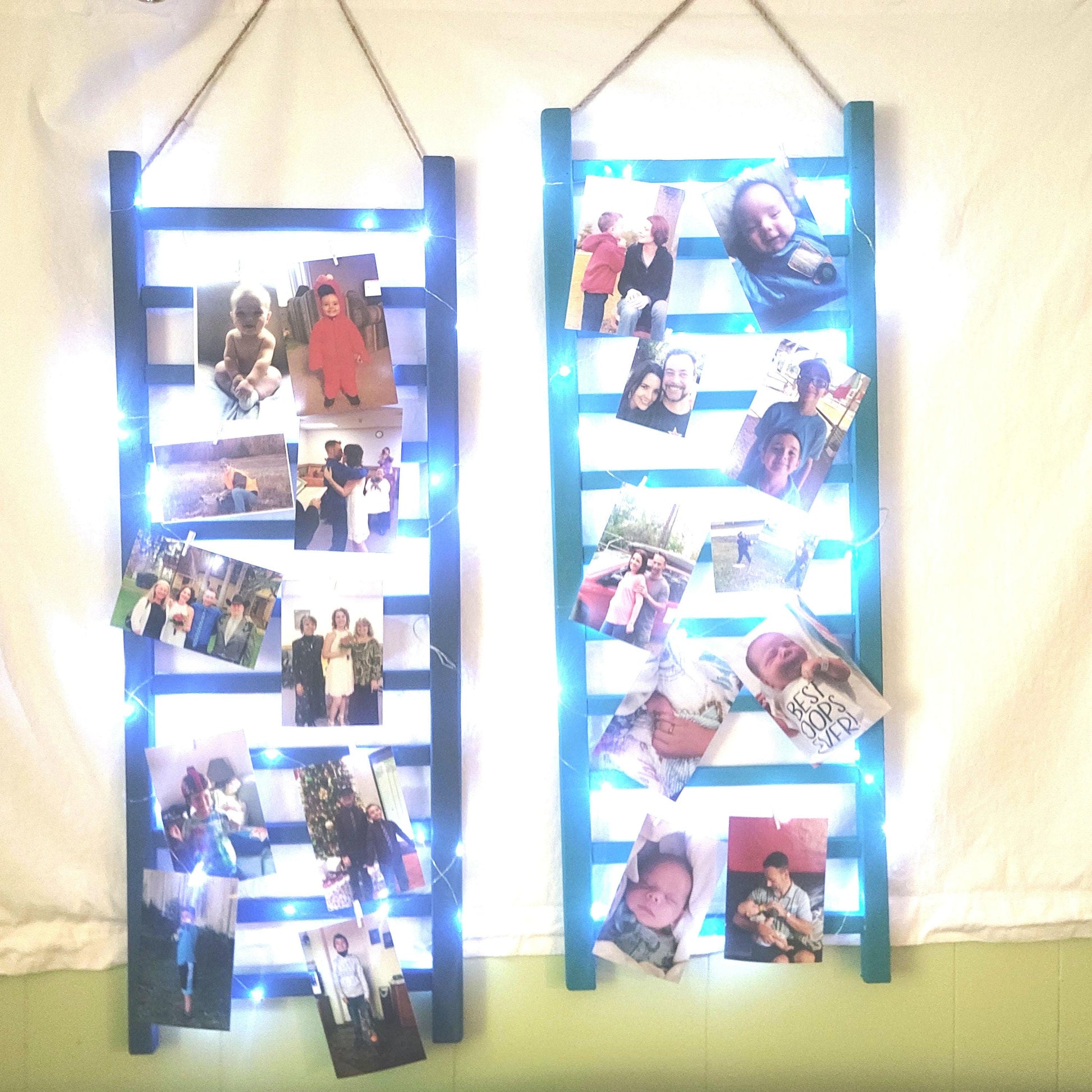 1 of 2 of a kind, handcrafted repurposed solid wood ladder picture frame, from a vintage crib, painted in blue green chalk paint and the other 1 blue, with white fairy lights and tiny white clothes pins to hang your pictures from. Measures 36" tall x 13" wide.