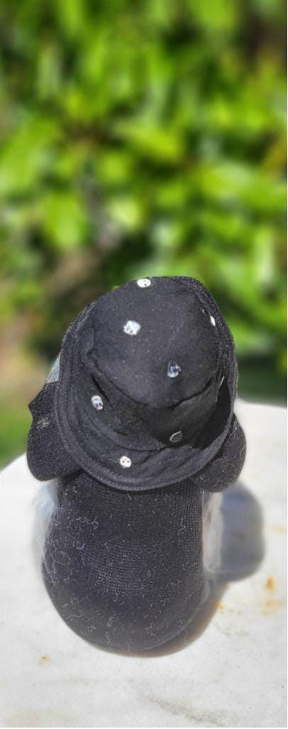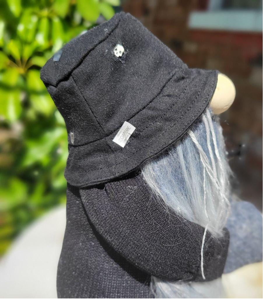 Meet Thunderglim Shadowhowler, he's one of a kind, limited edition hand crafted Heavy Metal Vocalist gnome singing into a microphone with a stand in tribute to Rob Zombie. The gnome is dressed all in black, wearing a boonie hat with skulls, wood ball nose, long flowing gray and black "dreaded" beard, and gray mittens and boots. He measures approximately 9" tall.
