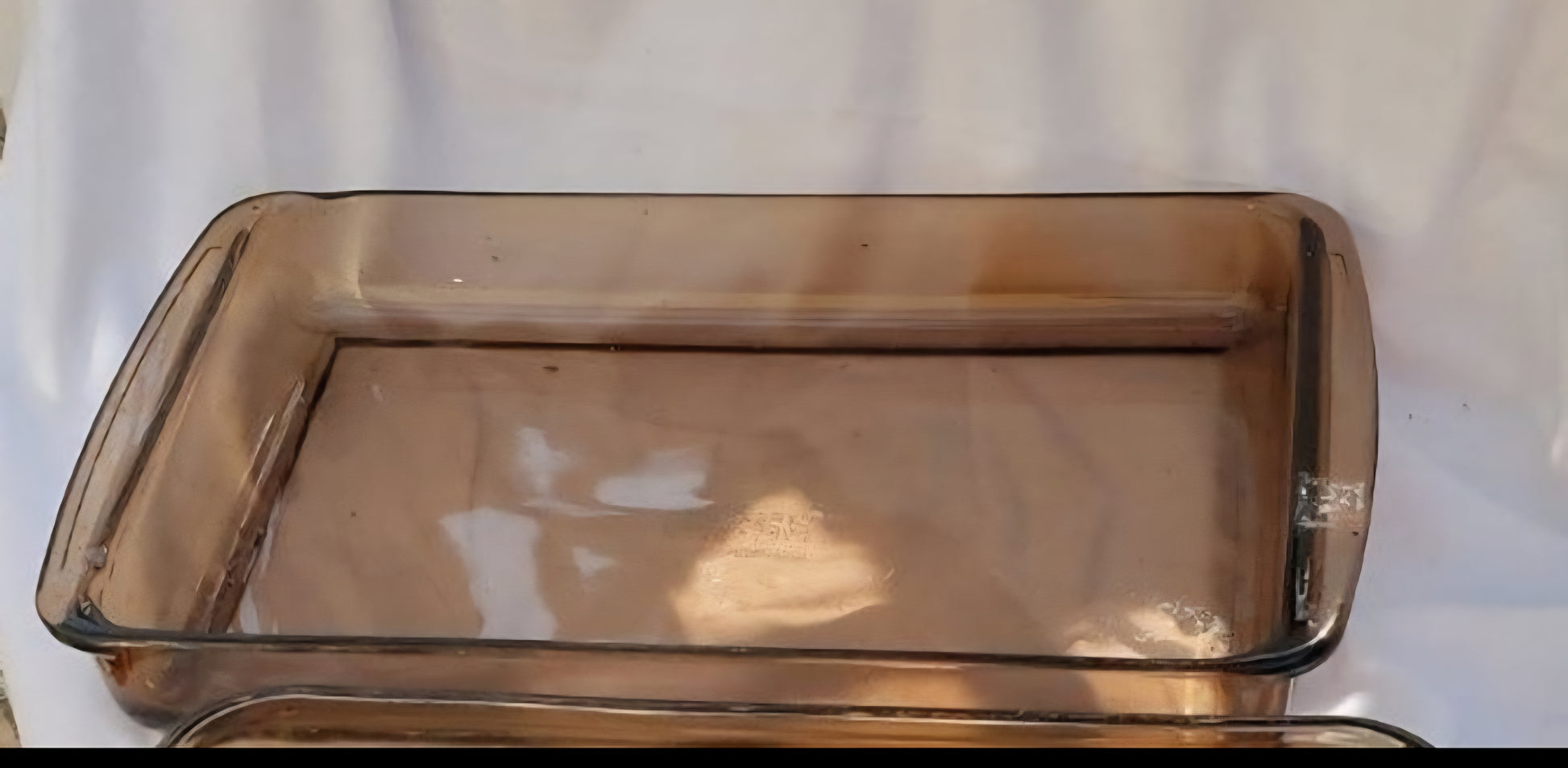 Gently used vintage Pyrex 233 amber glass casserole dish 13x9" 2.8L. No visible cracks or chips visible.