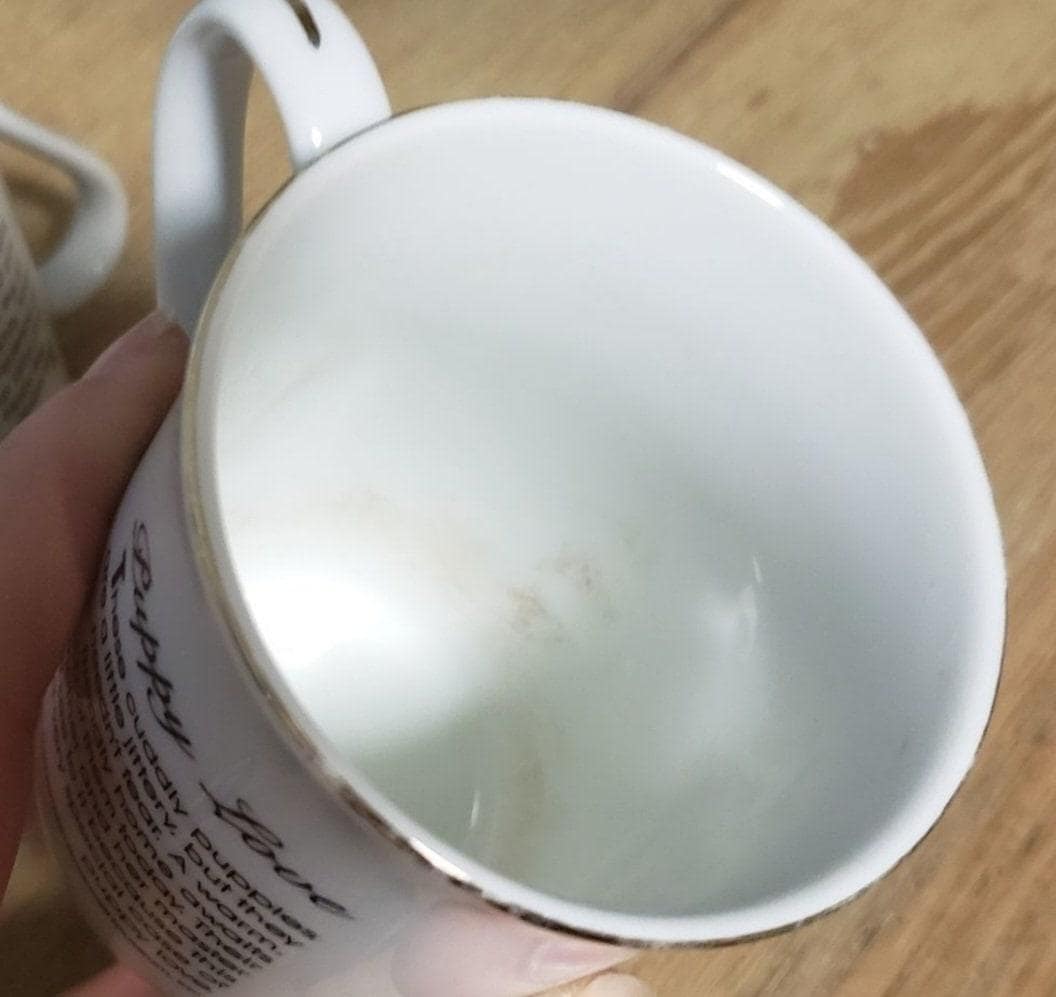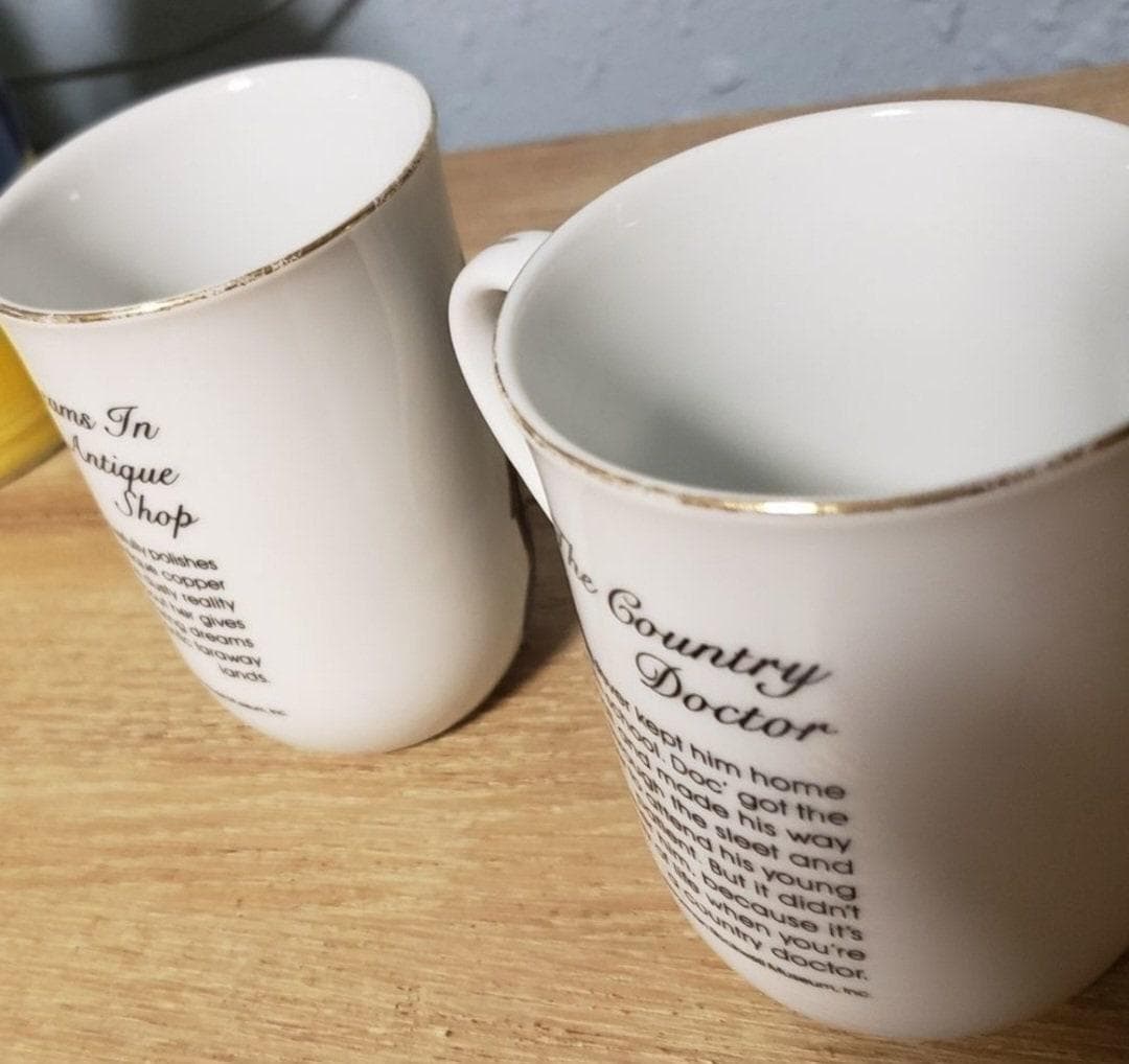 A set of 4 vintage 1985 Norman Rockwell mugs with gold rims. Set includes Country Doctor, Puppy Love, Looking out to sea and Dreams in the antique shop. 1 mug has slight staining as shown in last picture but no chips or cracks.