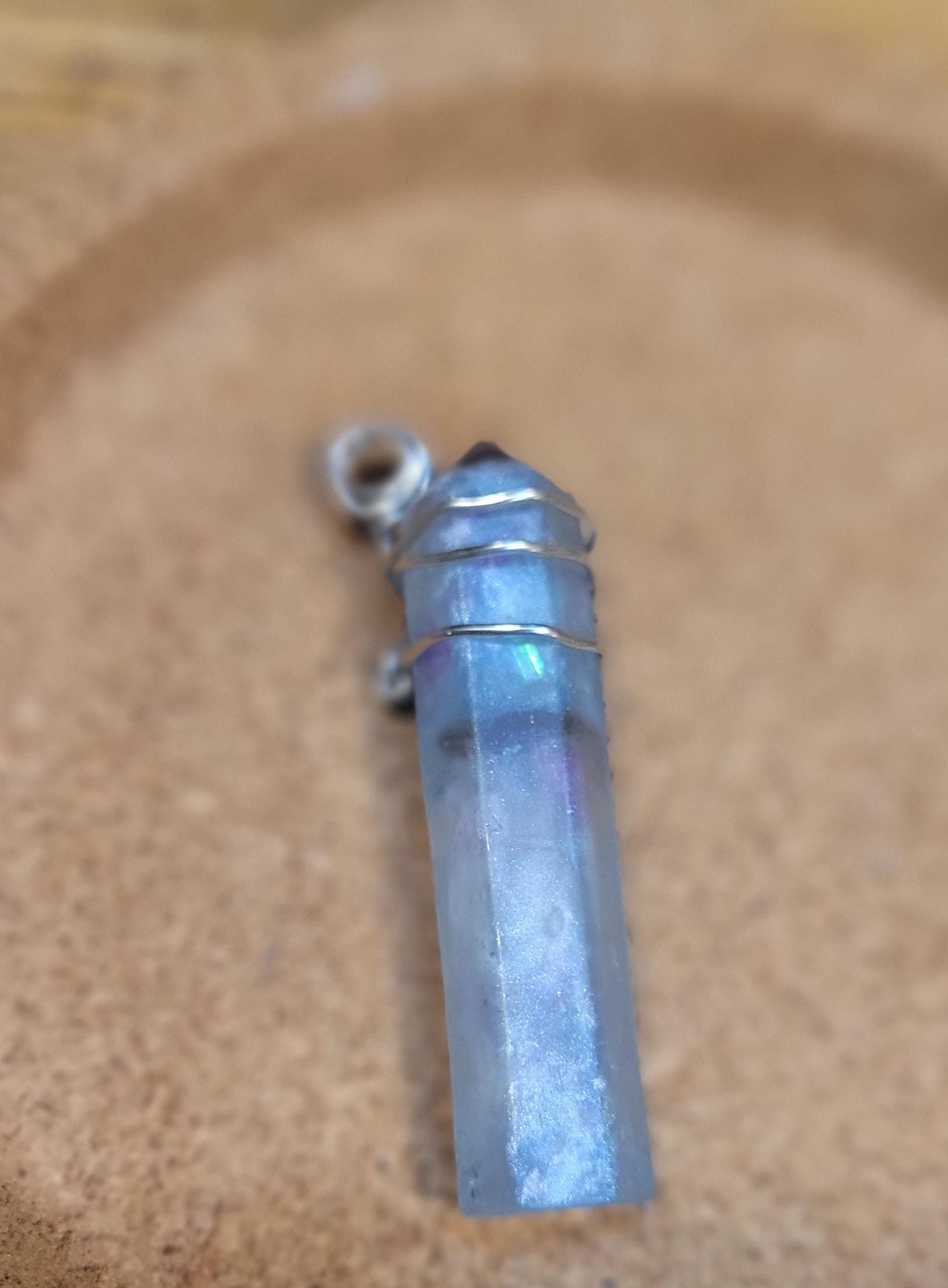Handmade resin crystal shaped pendant with miniature smoky quartz crystals embedded inside, blue and pink mica, and some glitter, wrapped with silver wire. It measures approximately 1.25" long.